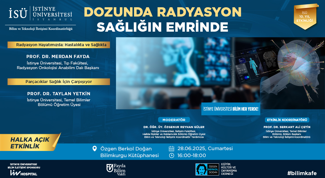 İstinye Üniversitesi, Bilim ve Teknoloji İletişim Koordinatörlüğü tarafından 28 Haziran 2025 tarihinde Bilim Kafe etkinlikleri kapsamında Dozunda Radyasyon Sağlığın Emrinde etkinliği gerçekleştirilecektir.
