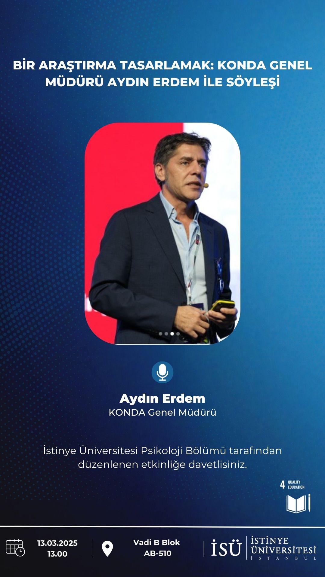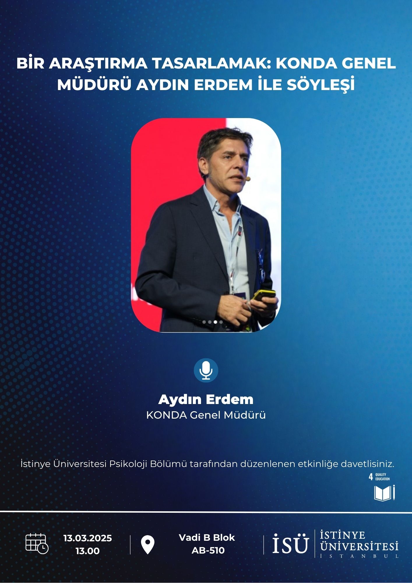 İstinye Üniversitesi Psikoloji Bölümü tarafından 13 Mart 2025 Perşembe günü, saat 13.00'da Vadi B Kampüs AB510 numaralı derslikte gerçekleştirilecek olan "Bir Araştırma Tasarlamak: KONDA Genel Müdürü Aydın Erdem ile Söyleşi" etkinliğine davetlisiniz.