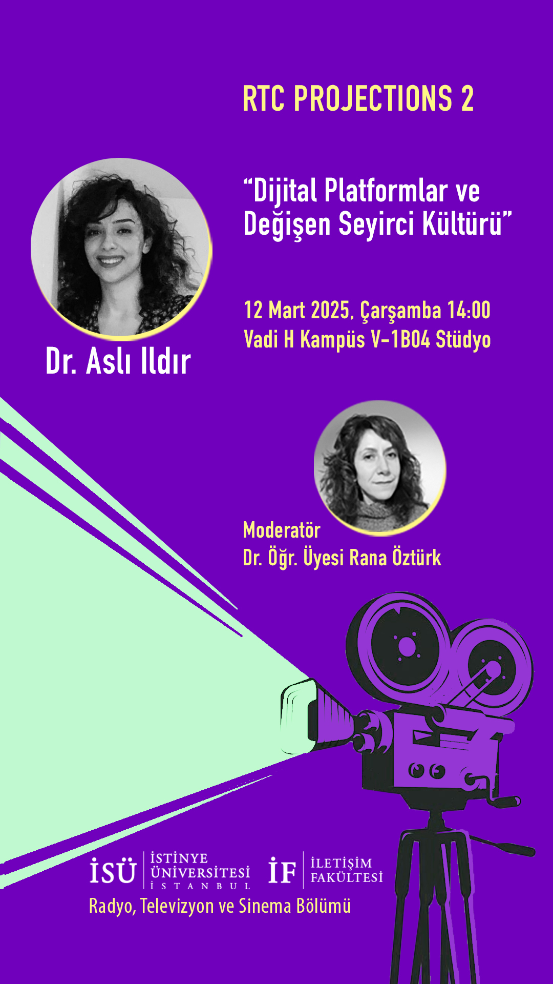 İstinye Üniversitesi İletişim Fakültesi, Radyo, Televizyon ve Sinema Bölümü, “RTC Projections” başlıklı konuşma serisinin ikincisi "Dijital Platformlar ve Değişen Seyirci Kültürü" isimli etkinliğe davetlisiniz.