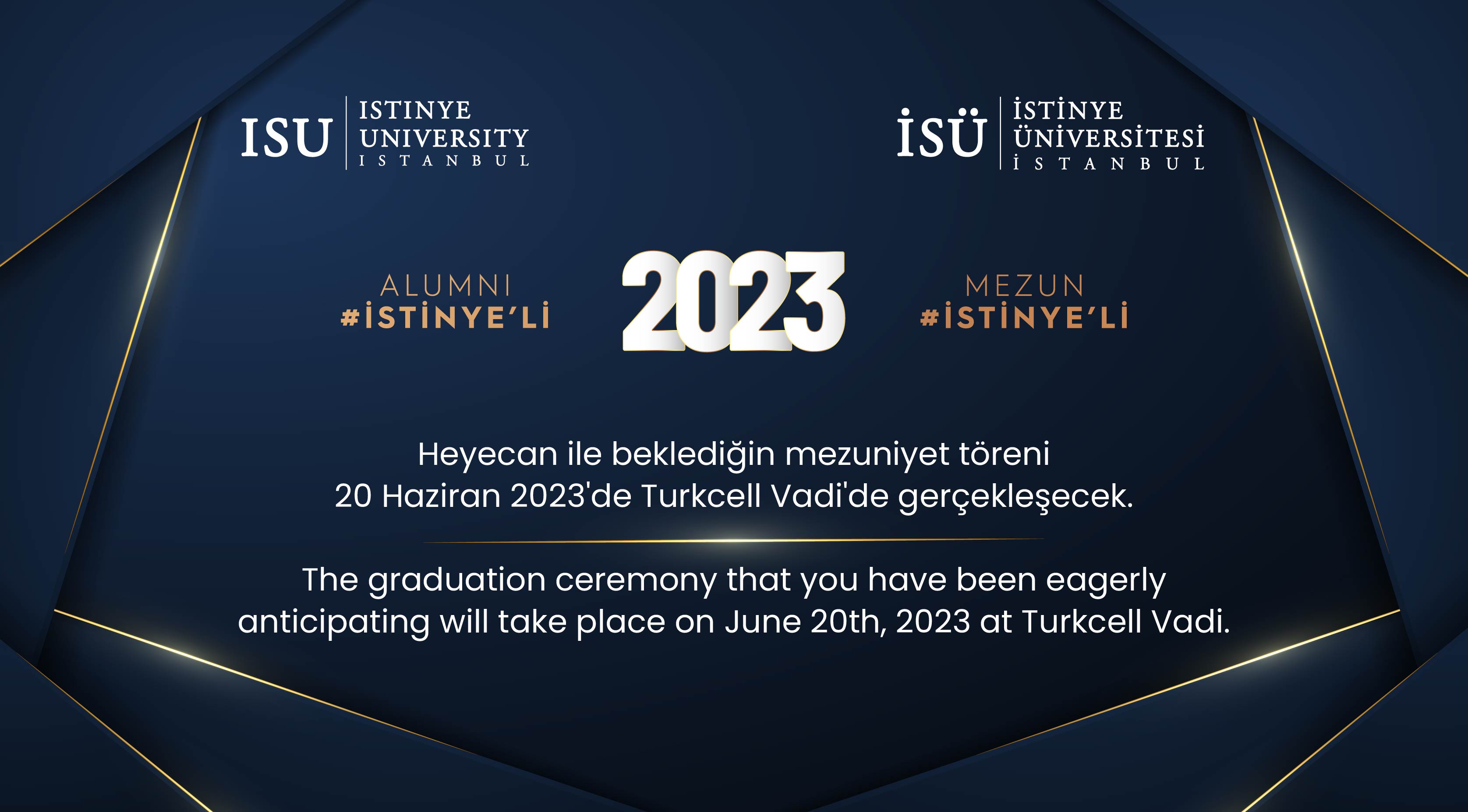 Istinye University 2023 commencement exercises will be held on Tuesday, 20 June 2023 in two sessions at the Turkcell Vadi Open Air Stage at 13:30 and 19:30. The Vocational School and Vocational School of Health Care Services commencement ceremony will take place at 13.30. The undergraduate commencement ceremony will take place at 19.30.