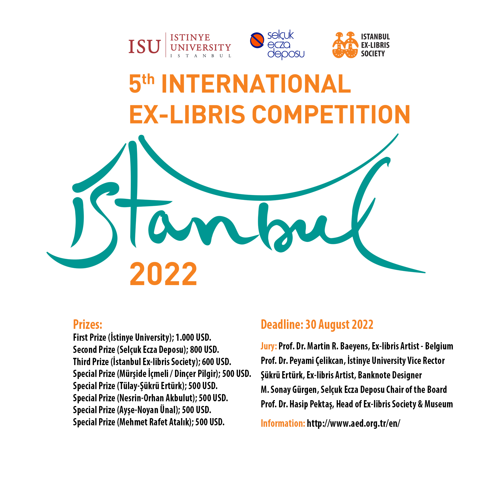 İstanbul Ex-libris Society, İstinye University, and Selçuk Ecza Deposu are organizing an international ex-libris competition open to artists and designers from all countries in order to bring together and evaluate authentic ex-libris prints of highest aesthetic, artistic and technical quality, created as marks of ownership for books, to encourage artists and to introduce the art of ex-libris to the general public and create interest in the subject.