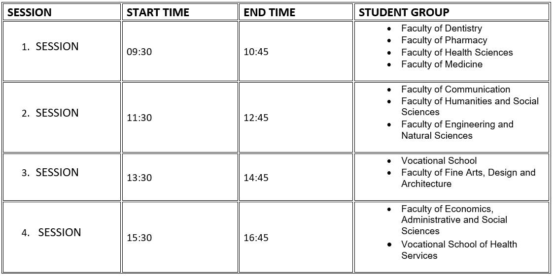 - Exams will only be held at Topkapı Campus. There will be no exams in the valley campuses.
