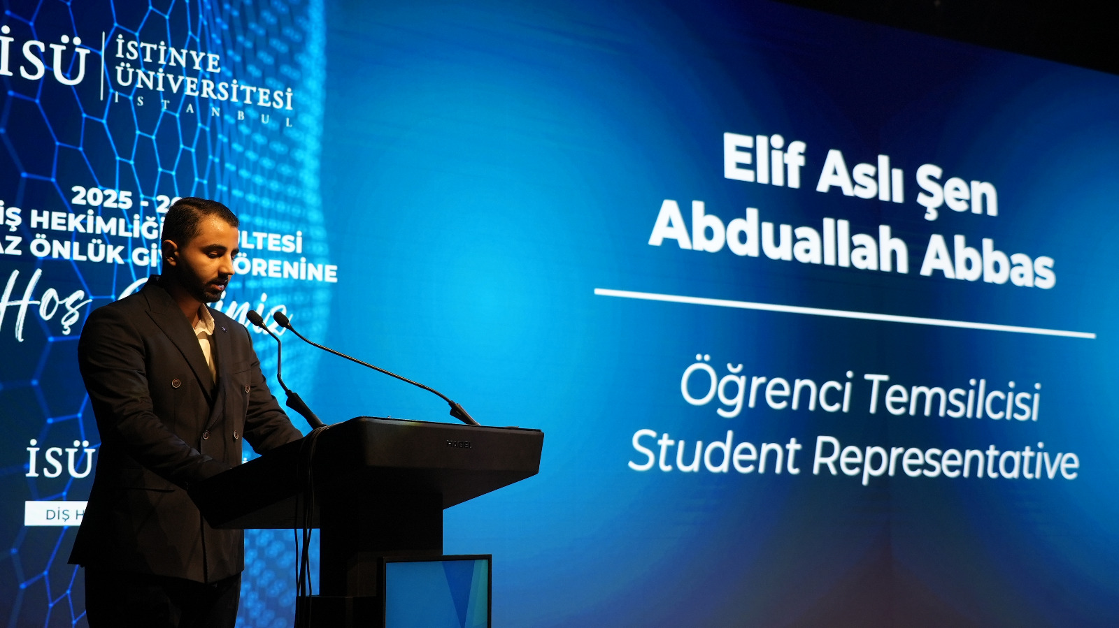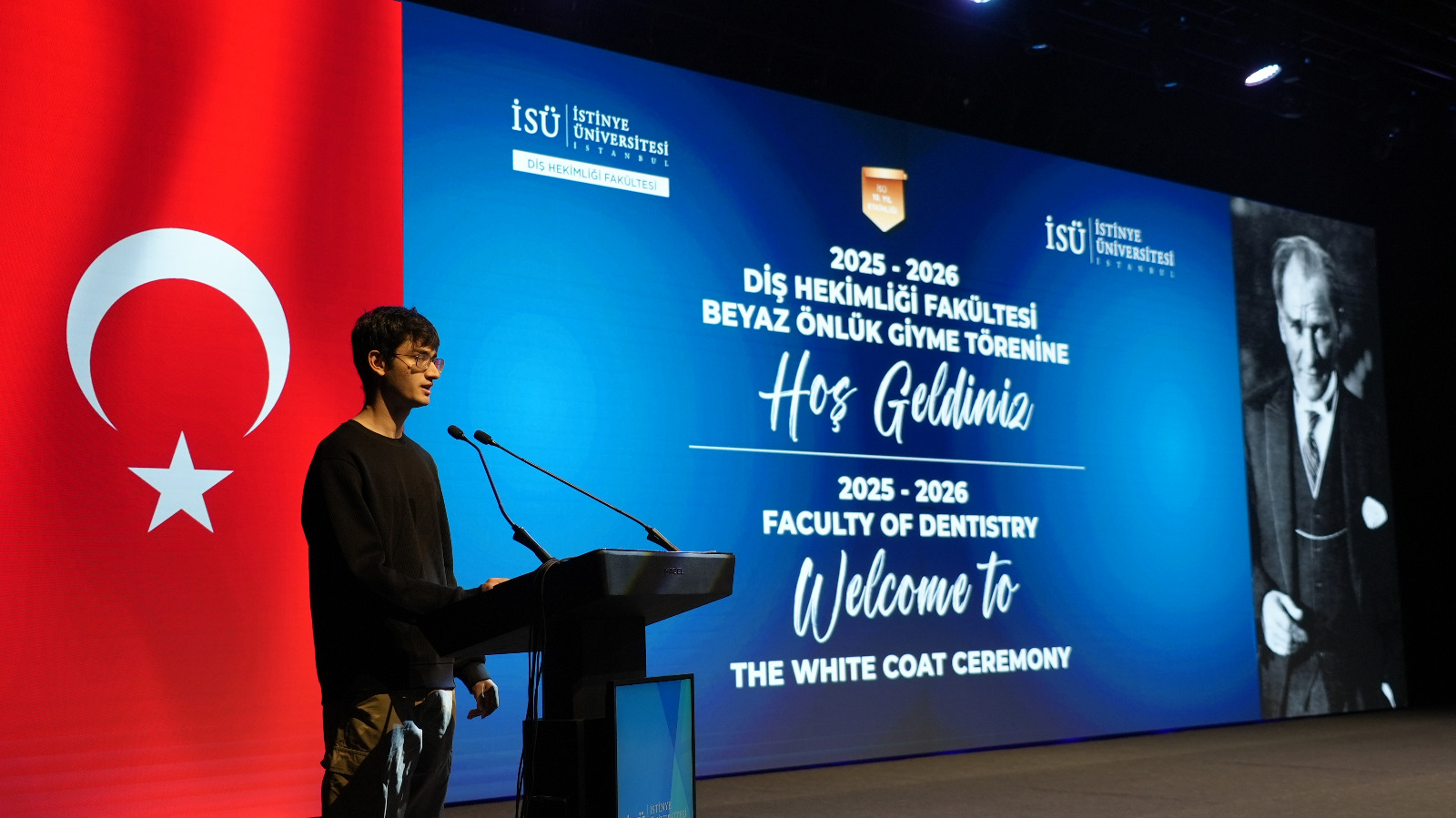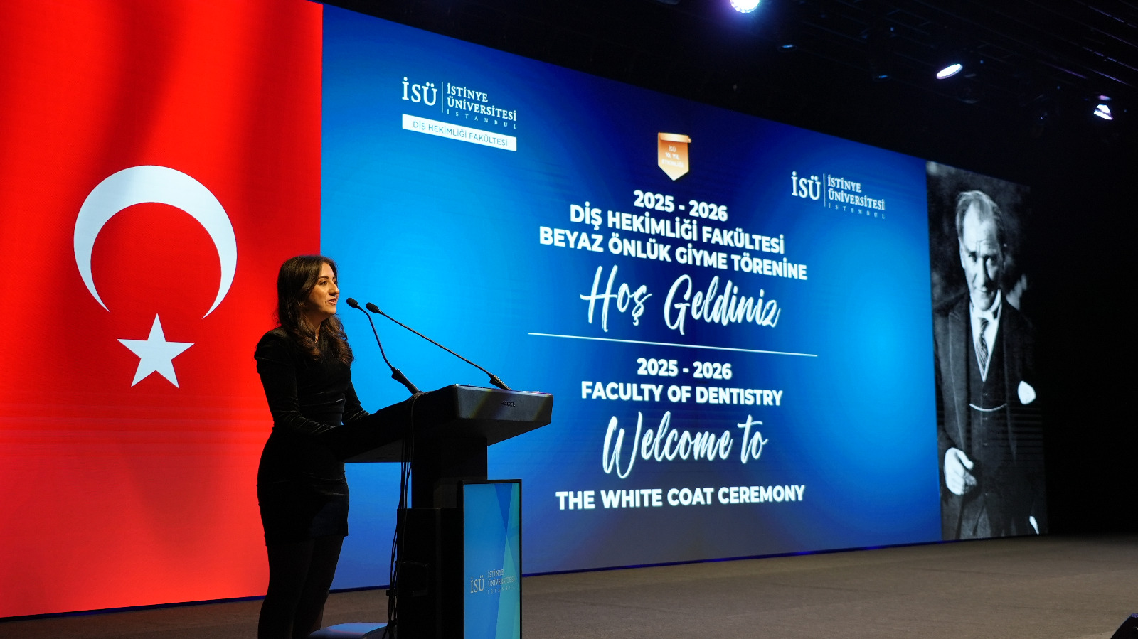 The program continued with remarks by Prof. Dr. Emir Yüzbaşıoğlu, Dean of the Faculty of Dentistry. Yüzbaşı said, "Dentistry is a profound journey that cannot be contained within a single lifetime. This white coat represents a lifetime of learning. Today, we are here not just for a ceremony, but to embark on a journey to the heart of the medical profession, to the meaning of the white coat, and to the Hippocratic tradition that forms the philosophical experience of this profession spanning thousands of years."
