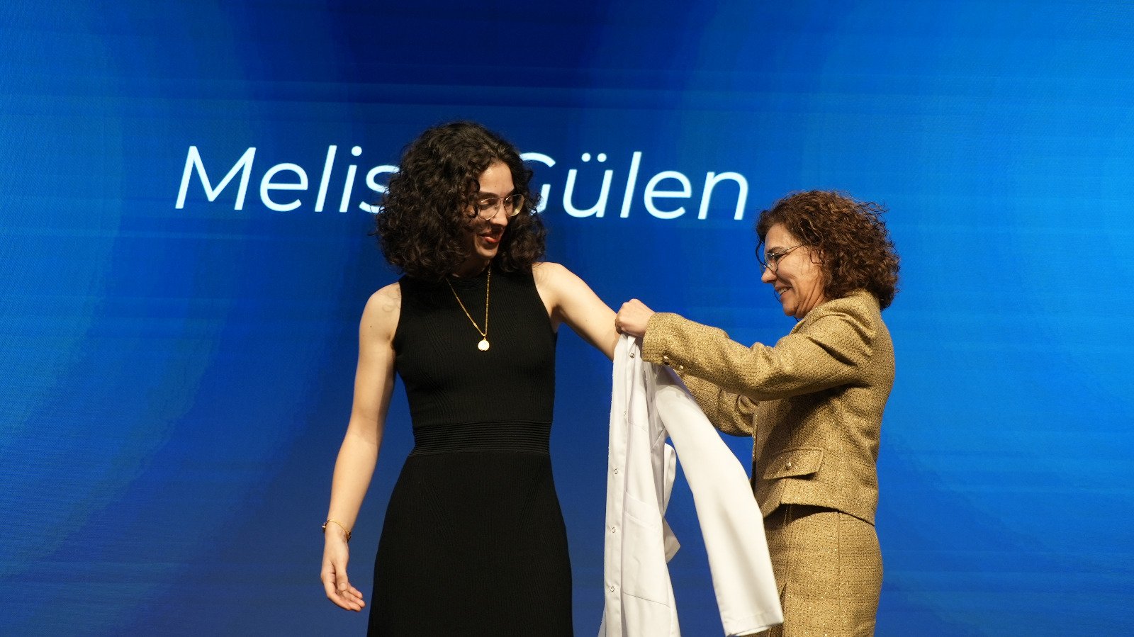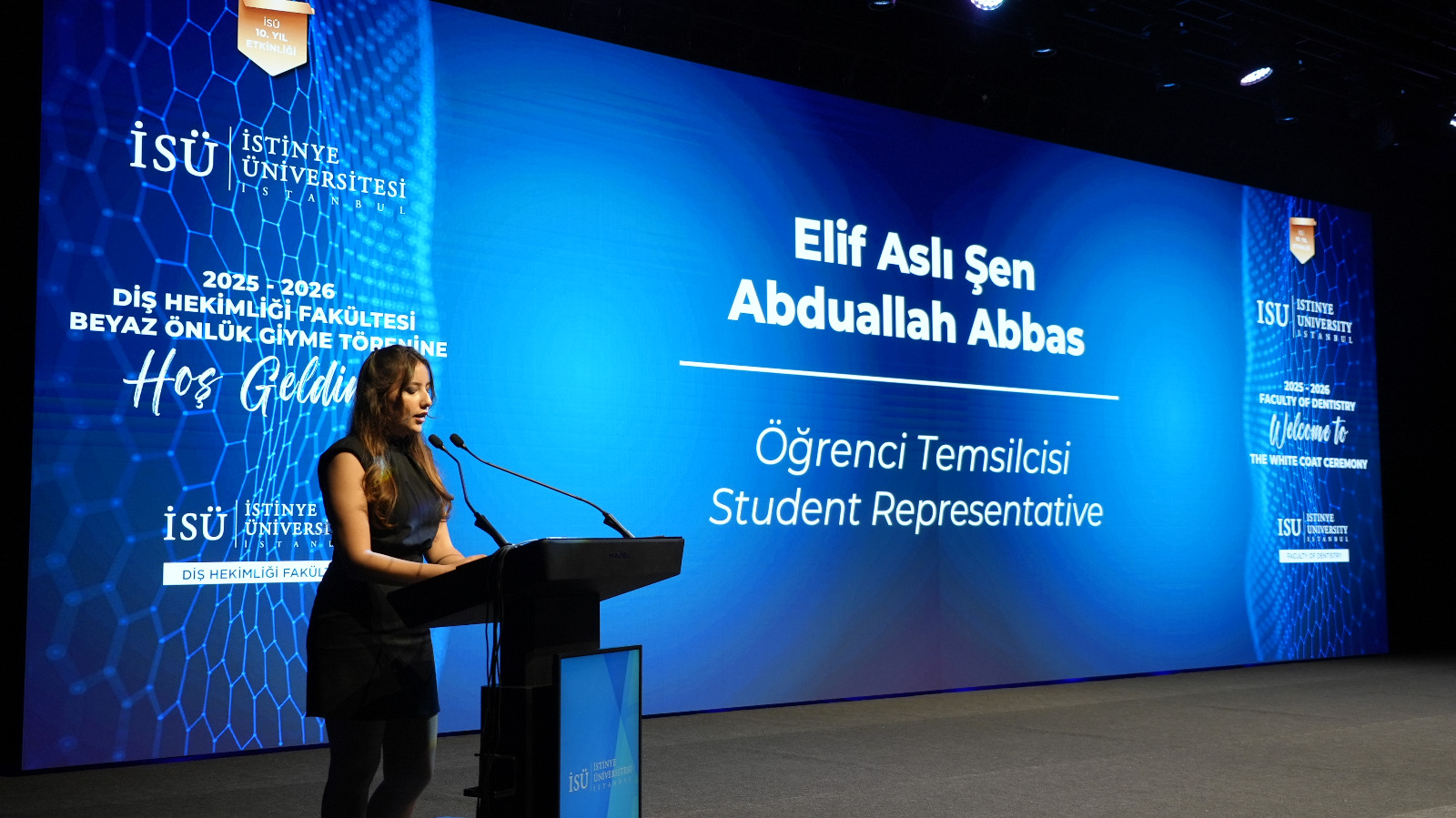 The White Coat Ceremony began with a musical performance, followed by speeches from national and international student representatives Elif Merve Bayer and Faris Kayali, who shared their excitement about education and training. Following the opening speeches, Dr. Ertay Atalar, Member of the Board of Directors of the Chamber of Dentists, offered advice to the prospective dentists. In his speech, he emphasized the strength of the academic staff and spoke about future projects, giving hope to the young prospective dentists.