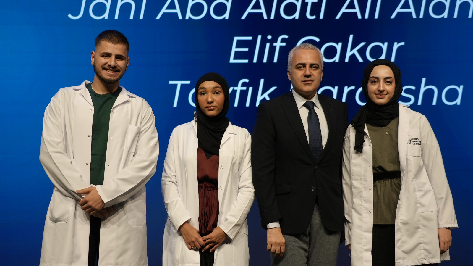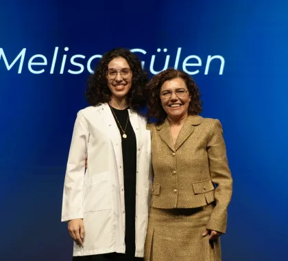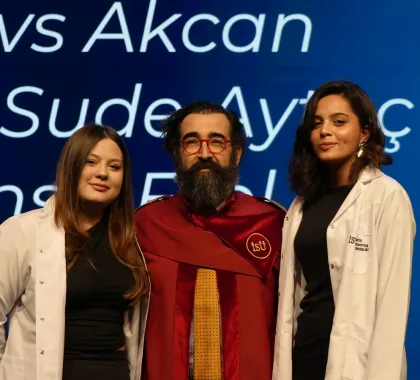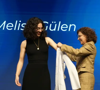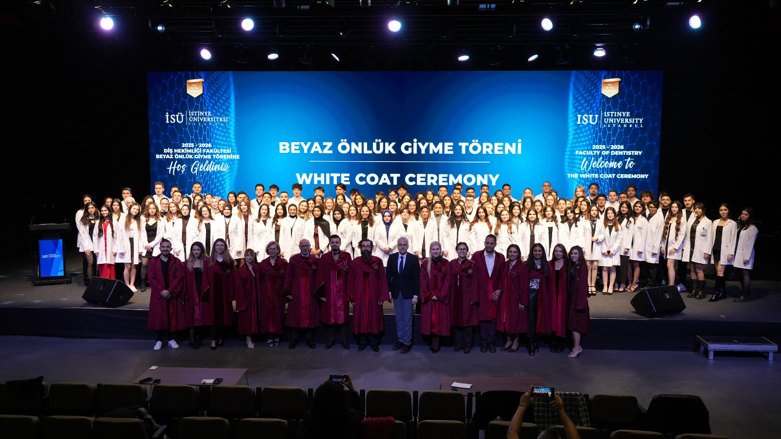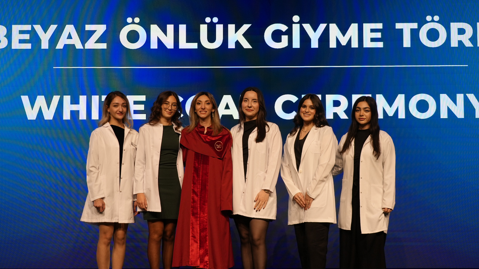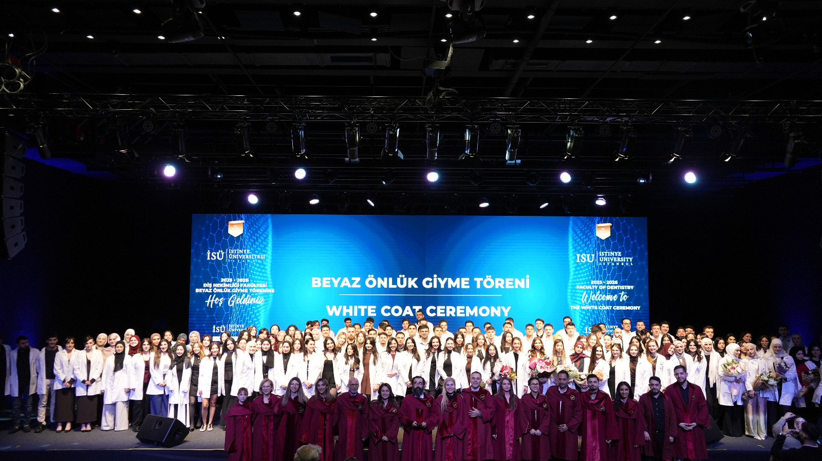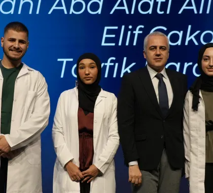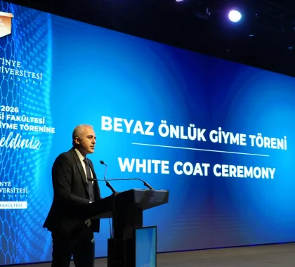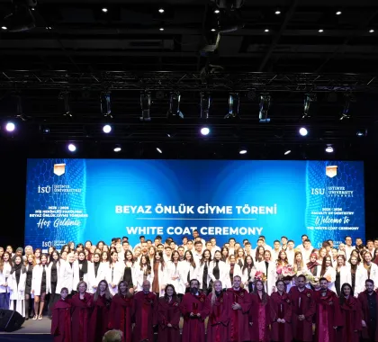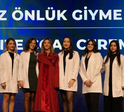 First-year students enrolled in the English and Turkish programs took their first step on their professional journey by donning their white coats, presented by our academics. This session, which drew great interest from families, concluded with a group photo.