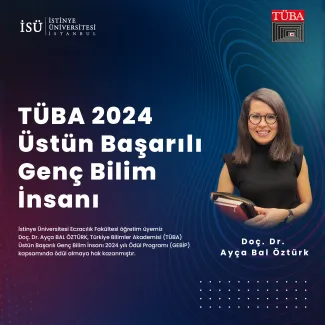 Assoc. Prof. Dr. Ayça BAL ÖZTÜRK, a faculty member of the Faculty of Pharmacy at Istinye University, has been awarded the TÜBA Outstanding Young Scientist 2024 Award (GEBİP) as part of the Turkey Academy of Sciences (TÜBA) 2024 Outstanding Young Scientist Award Program.