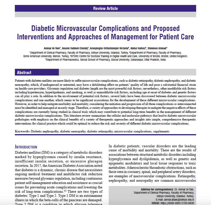 Our faculty member of the Faculty of Pharmacy, Dr. Anmar Al-Taie's review article named ''Diabetic microvascular complications and proposed interventions and approaches of management for patient care'' was published in ''Biomedical and Biotechnology Research Journal (BBRJ)''.