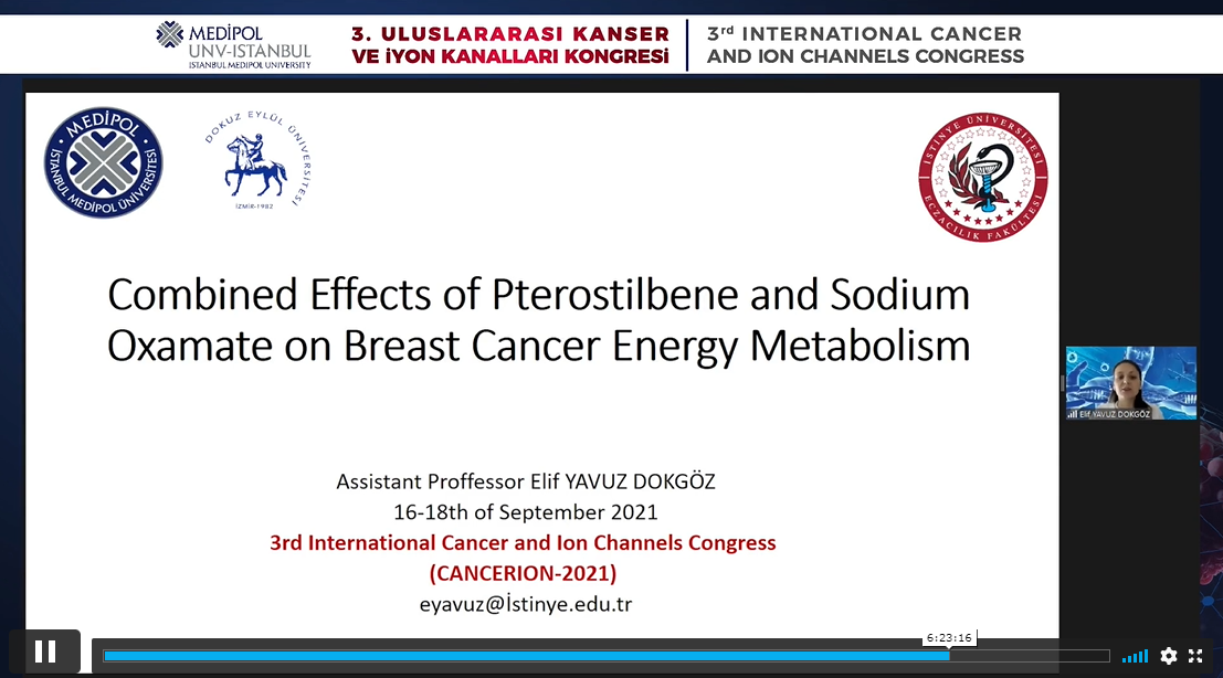 Istinye University Faculty of Pharmacy Faculty Member Dr. Elif YAVUZ DOKGÖZ attended the 3rd International Cancer and Ion Channels Congress between 16-18 September 2021 and made her online presentation titled 'Combined Effects of Pterostilbene and Sodium Oxamate on Breast Cancer Energy Metabolism' .
