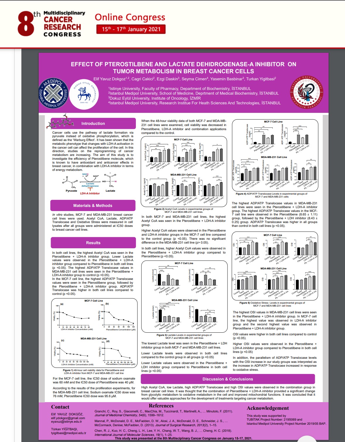 Lecturer Dr. Elif Yavuz Dokgöz's paper titled "Effect of Pterostilben and LDH-A inhibitor on Tumor Metabolism in Breast Cancer Cells" was presented as a poster presentation at the 8th Multidisciplinary Cancer Research Congress held between 15-17 January 2021. (PB0053)