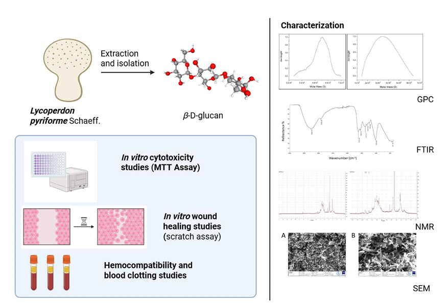 In the study, the structural properties of β-D-glucan obtained from Lycoperdon pyriforme mushrooms collected in their natural environment in Sultan Murat Highlands, Trabzon-Çaykara, were examined and characterized. In cell culture studies, it was revealed that this natural compound accelerates cell migration, exhibits hemostatic effects, and contributes to the wound healing process.