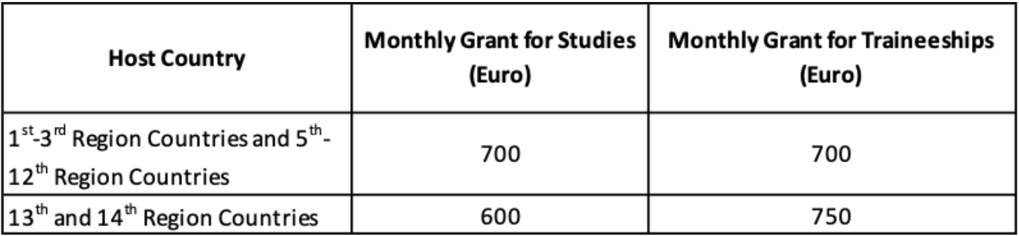 The countries where student mobility activities can be carried out were divided into 3 groups according to their standard of living and monthly learning and internship grants were determined for the country groups.