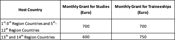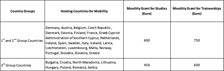 The countries where student mobility activities can be carried out were divided into 3 groups according to their standard of living and monthly learning and internship grants were determined for the country groups.