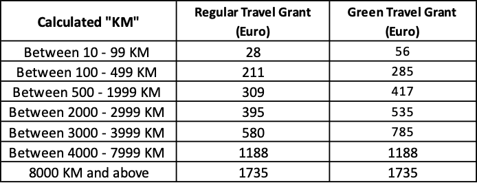 In order to contribute to students' travel expenses, the distance between the starting point of mobility and the location of the activity is determined using the distance calculator provided by the European Commission (http://ec.europa.eu/programmes/erasmus-plus/tools/distance_en.htm). Based on this distance, the travel grant is calculated using the table below. The value shown in the distance band calculator corresponds to the round-trip grant amount in the table below, and this amount is not multiplied by two.