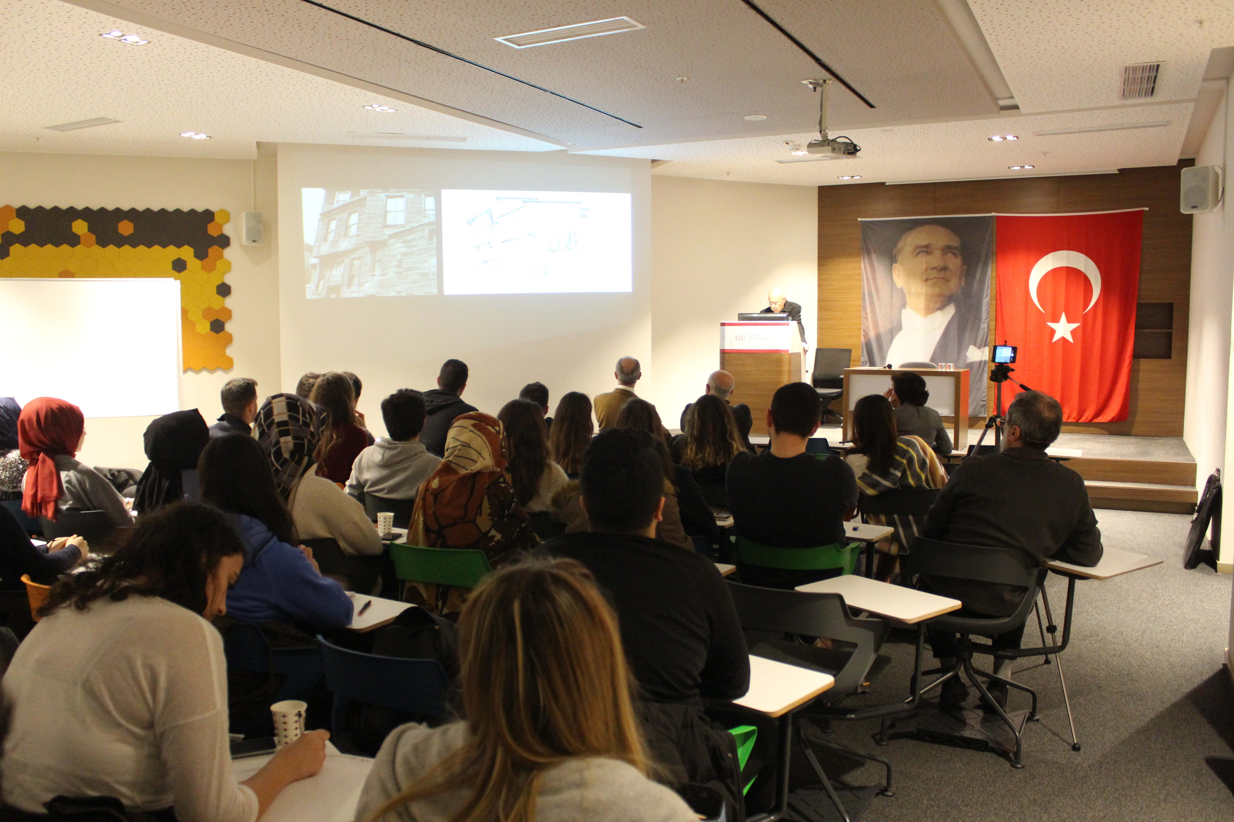 Mimarlık mesleğini okumak ve tasarlamak olarak iki bağlamda anlatan Prof. Dr. Atilla Yücel, örnek proje tasarıları ve eskizleri üzerinden mesleki tecrübelerini anlattı. Mimari projeleri; yer, mekan, dil ve kent planlaması çerçevesinde ele alan Prof. Dr. Atilla Yücel, yapıların restorasyon ve rehabilitasyon süreçlerinde dikkat edilmesi gereken konular üzerinde durdu.