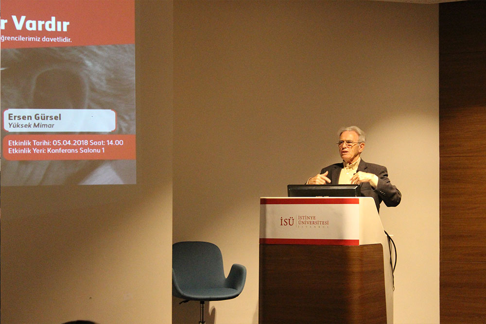 İstinye Üniversitesi Mimarlık ve Tasarım Fakültesi tarafından düzenlenen “Çevre’nin Tasarımında Mimar Vardır” isimli etkinlik, mimar Ersen GÜRSEL’in katılımıyla 5 Nisan Perşembe günü İstinye Üniversitesi Topkapı Kampüsü’nde gerçekleşti.
