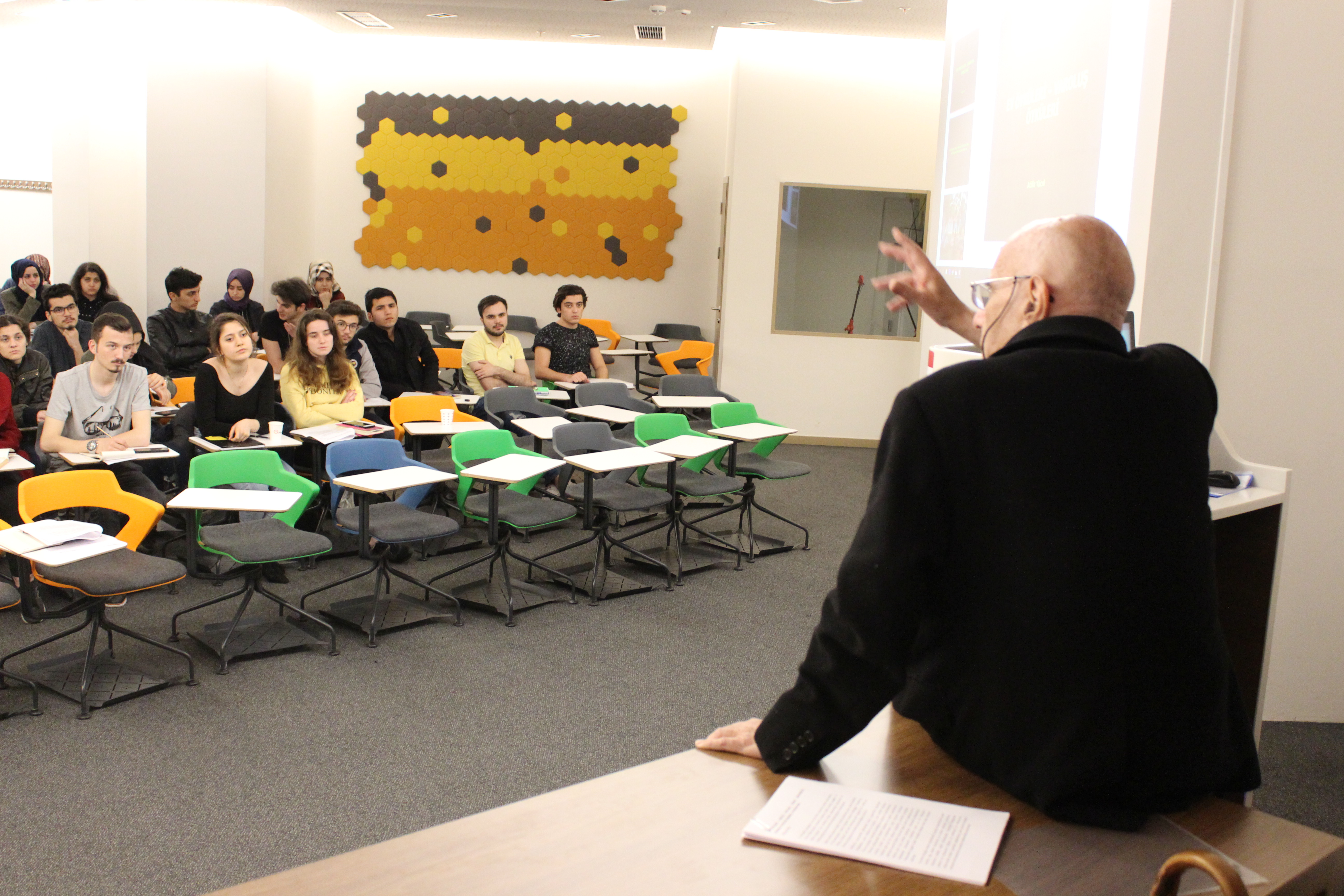 Mekanların tasarlanmasında kullanıcı ve mimar ilişkisini değerlendiren Prof. Dr. Atilla YÜCEL, evlerin kullanım önceliğine göre tasarlanmasının önemine dikkat çekti. Getirdiği örnekler üzerinden evlerin mimari ve kullanım özelliklerini gösteren Prof. Dr. Atilla YÜCEL, etkinlik sonunda öğrencilerin meslek hakkındaki sorularını cevapladı.