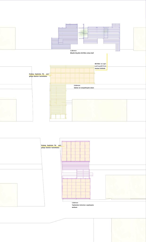 The 2nd space shown in yellow was designed as a "stage unit". This unit was intended to establish a relationship with both space 1 and space 3. The relationship with the 1st space was established with the deck and gazebo and the relationship with the 3rd space was established through the stage. The fabric pieces of the stage unit and the lower unit that would provide shade in the summer were not installed because the season was coming to an end, and the fabrics were stored in the area to be used the following year.