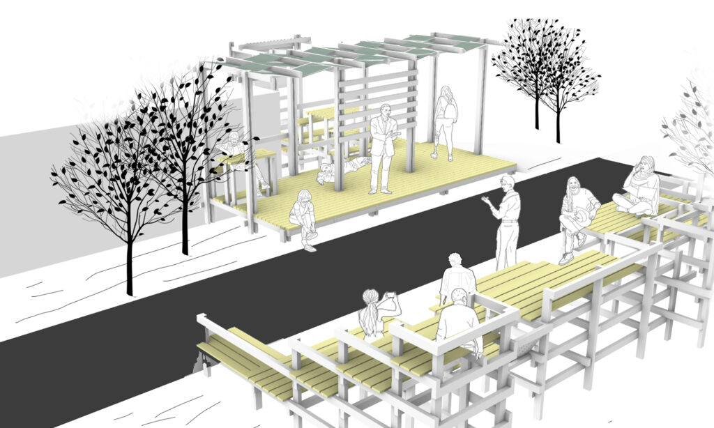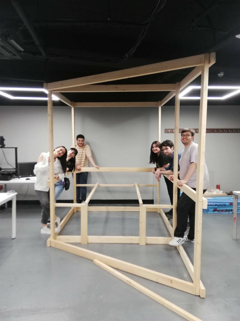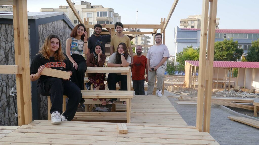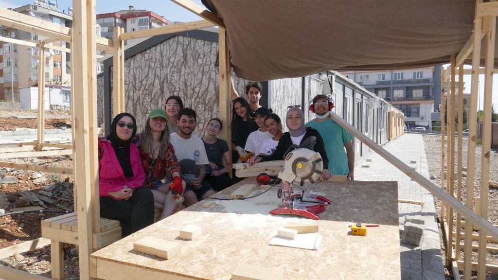 After design studies and prototype trials were carried out at Istinye University for 2 weeks with the team, which was selected among the architecture and interior architecture students from different schools who applied to the open call, the participants traveled to Kahramanmaraş with the participants, and the project was implemented in 11 days. The booklet of the project was prepared in the week after the implementation was completed and we left Kahramanmaraş. During the implementation, the participants stayed in empty containers in Mimkent. Dulkadiroğlu Municipality provided the wood materials for the project, while other costs were covered by Kahramanmaraş Chamber of Architects and Architecture for All (Herkes İçin Mimarlık) Association.