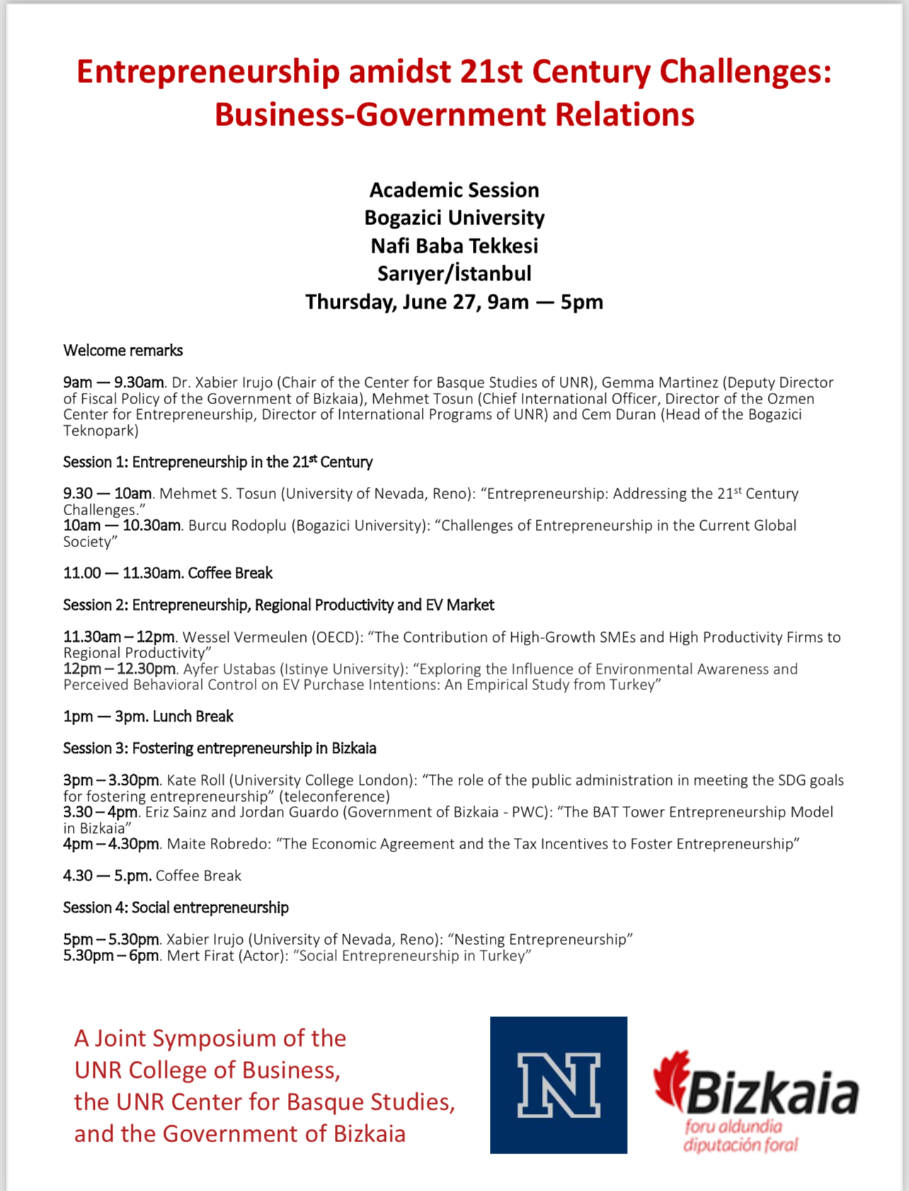 Our department faculty member, Assoc. Prof. Dr. Ayfer Ustabaş, presented her paper titled 'Exploring the Influence of Environmental Awareness and Perceived Behavioral Control on EV Purchase Intentions: An Empirical Study from Turkey' at the symposium organized by Boğaziçi University, UNR College of Business, UNR Center for Basque Studies, and the Bizkaia Governorship, titled 'Entrepreneurship amidst 21st Century Dynamics: Business-Government Relations'.