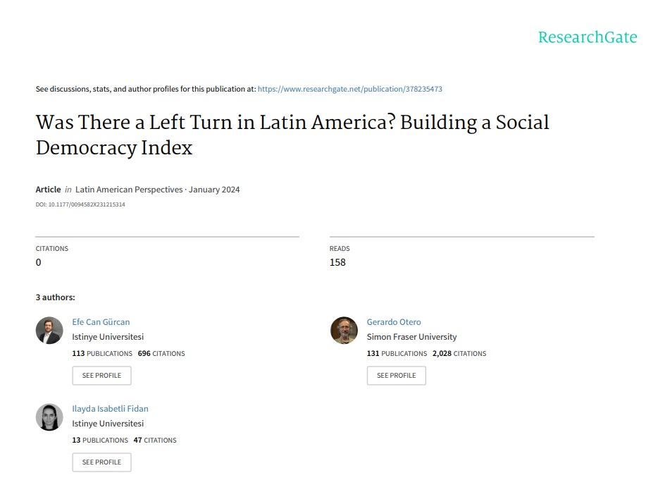 Economics Department member Asst. Prof. İlayda İSABETLİ FİDAN's article titled "Was There a Left Turn in Latin America? Building a Social Democracy Index" was published in Latin American Perspectives journal, one of the Q2 journals of the SJR (SCImago) index.