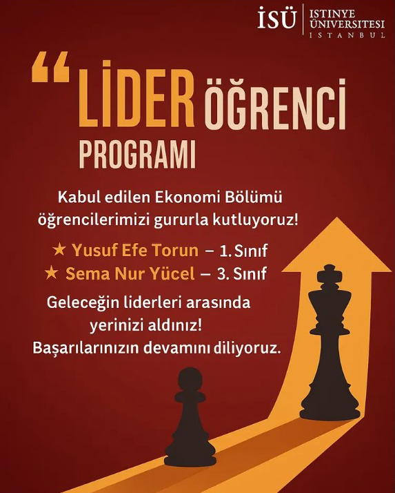 Two outstanding students from Istinye University’s Department of Economics — Yusuf Efe Torun (1st year) and Sema Nur Yücel (3rd year) — have been selected to participate in the university’s prestigious Leader Student Program, marking a significant achievement.