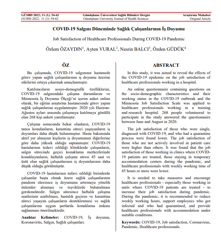 Our Faculty member Asst. Prof. Dr. Özlem Özaydın's article, "Job Satisfaction of Health Workers in the Period of COVID-19 Outbreak" was published in the Gümüşhane University Journal of Health Sciences.