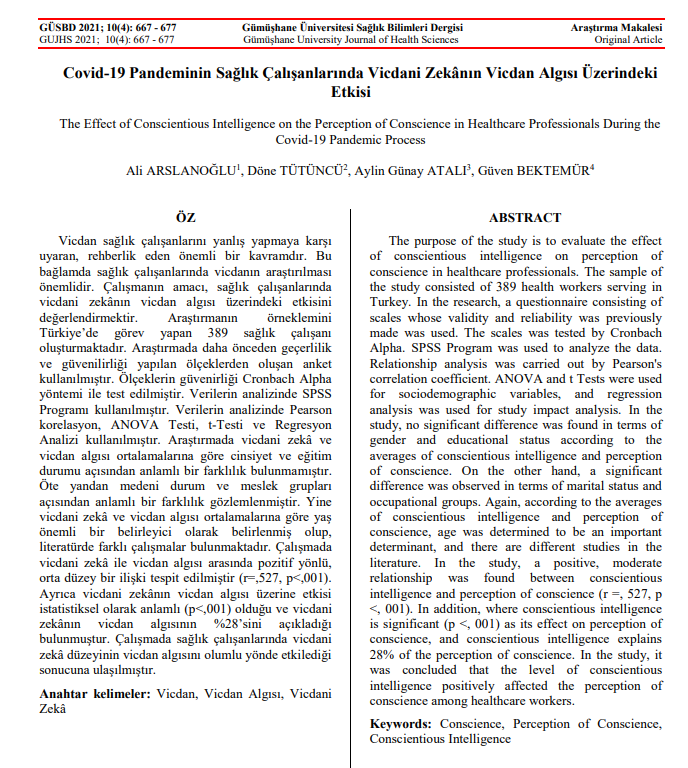 The article of Döne Tütüncü, Research Assistant at the Faculty of Economics, Administrative and Social Sciences, Health Management Department of our university, titled "The Effect of the Covid-19 Pandemic on the Perception of Conscientious Intelligence in Health Care Professionals" was published in the Gumushane University Health Sciences Journal.