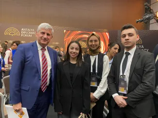 Ahmet Hakan KAYHAN, a senior student in the Department of International Relations, participated in the Antalya Diplomacy Forum. During the panel discussion on "Forced Displacement and International Responsibility", Hakan had the opportunity to engage in conversation with Michael Spindelegger, Director General of the International Centre for Migration Policy Development (ICMPD), where he shared the knowledge and insights he gained from the "Artificial Intelligence and Migration Governance" course offered within his department.