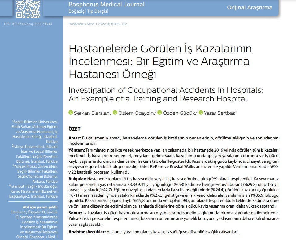 Dr. Özlem Özaydın, Assistant Professor in the Department of Health Management, has published an article titled *“An Examination of Occupational Accidents in Hospitals: The Case of a Training and Research Hospital”* in the **Bosphorus Medical Journal**.