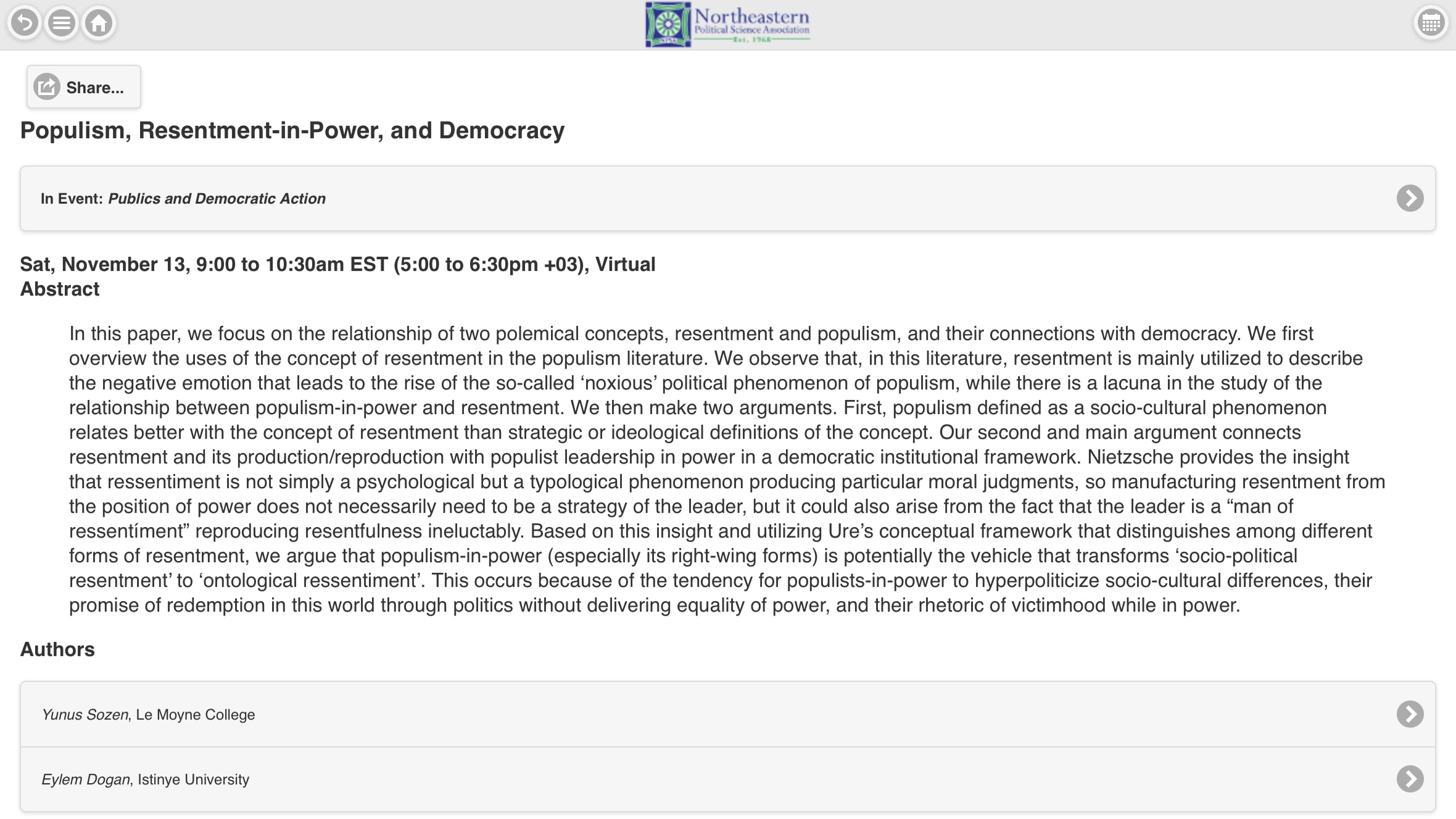 The paper titled “Populism, Resentment-in-Power, and Democracy” prepared by Asst. Prof. Eylem Doğan from the Departman of Philosophy at İstinye University and Asst. Prof. Yunus Sözen from Department of Political Science, Le Moyne College in the USA was presented at the 53nd Annual Conference of the Northeastern Political Science Association, on November 11-13, 2021 in Boston, USA.