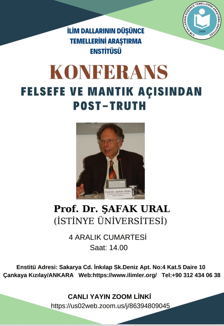 Prof. Dr. Şafak Ural, Head of Philosophy Department, gave a speech titled "Post-Truth in terms of Philosophy and Logic" on December 4, 2021 at Research Institute for Philosophical Foundations of Disciplines.