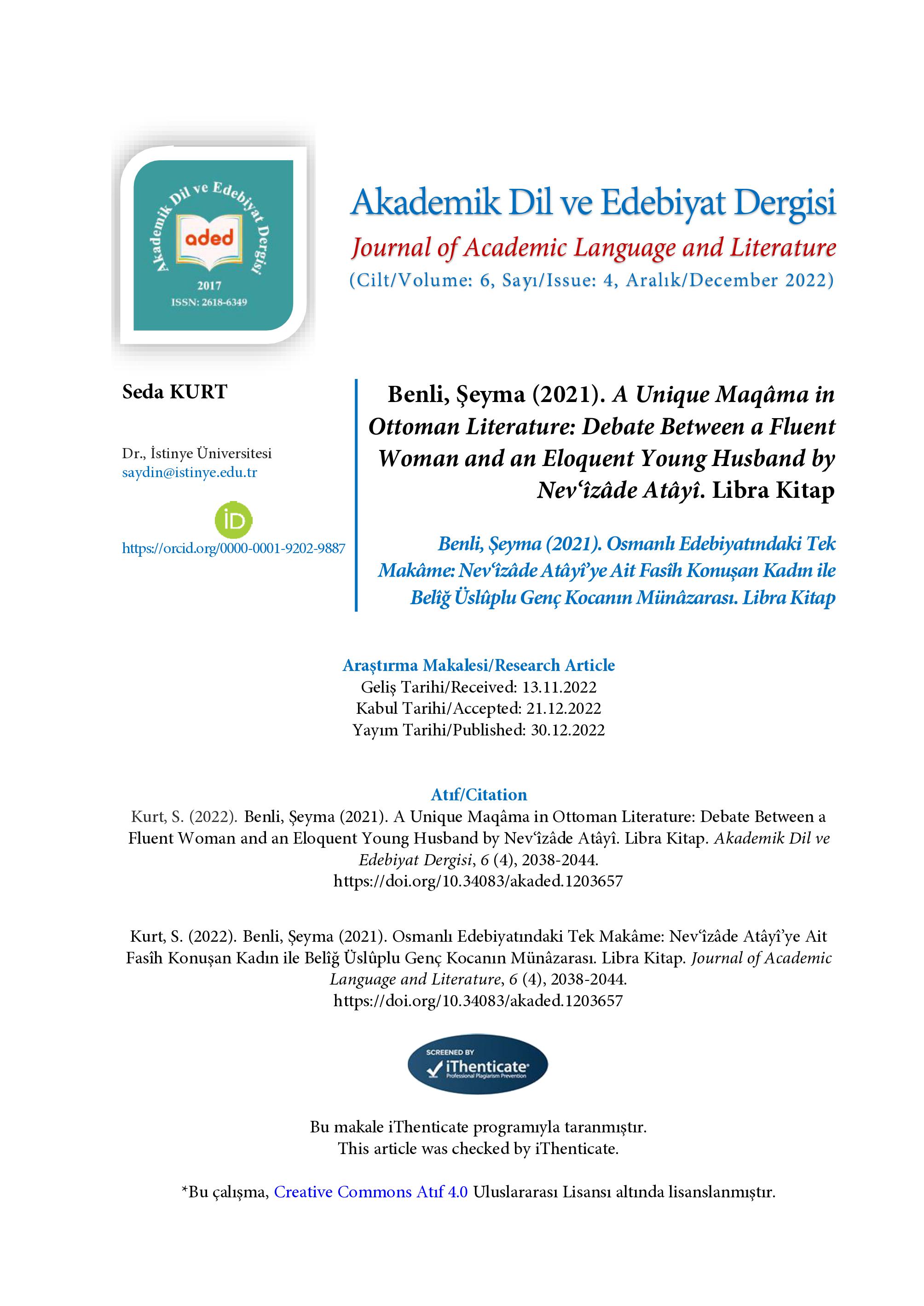 Res. Assist. Dr. Seda Kurt's book review was published in Journal of Academic Language and Literature. You can reach the full text of the book review from the link given: https://dergipark.org.tr/tr/download/article-file/2768788