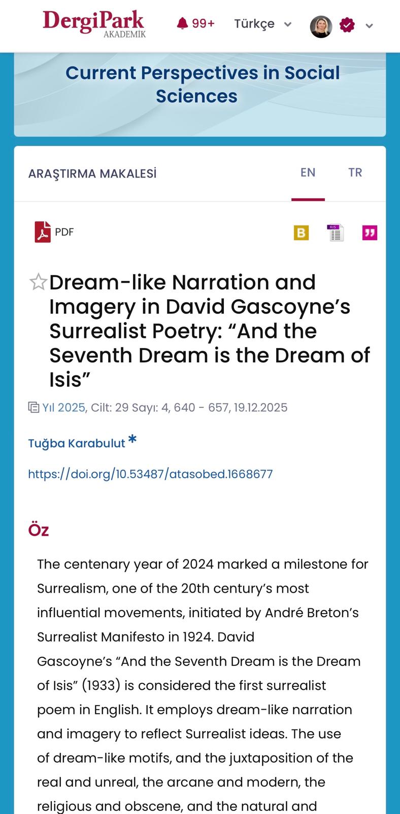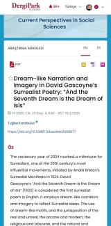 Dr. Tuğba Karabulut, Head of the Department of English Language and Literature, has published a new article entitled “Dream-like Narration and Imagery in David Gascoyne's Surrealist Poetry: ‘And the Seventh Dream is the Dream of Isis’” in Current Perspectives in Social Sciences, Volume 29, Issue 4 (December 2025).