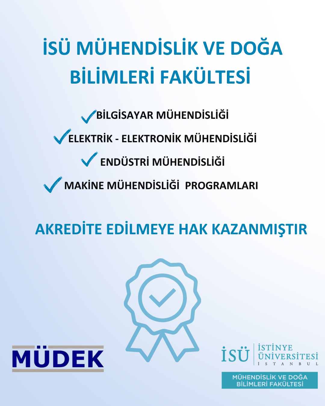 Our Departments of Computer Engineering, Industrial Engineering, Electrical and Electronics Engineering, and Mechanical Engineering have been granted accreditation by the Association for Evaluation and Accreditation of Engineering Programs (MÜDEK), an independent organization that carries out accreditation, evaluation, and advisory activities for engineering education programs across various disciplines. This achievement confirms the quality of our engineering education not only at the national level but also internationally, as MÜDEK accreditation is recognized globally.