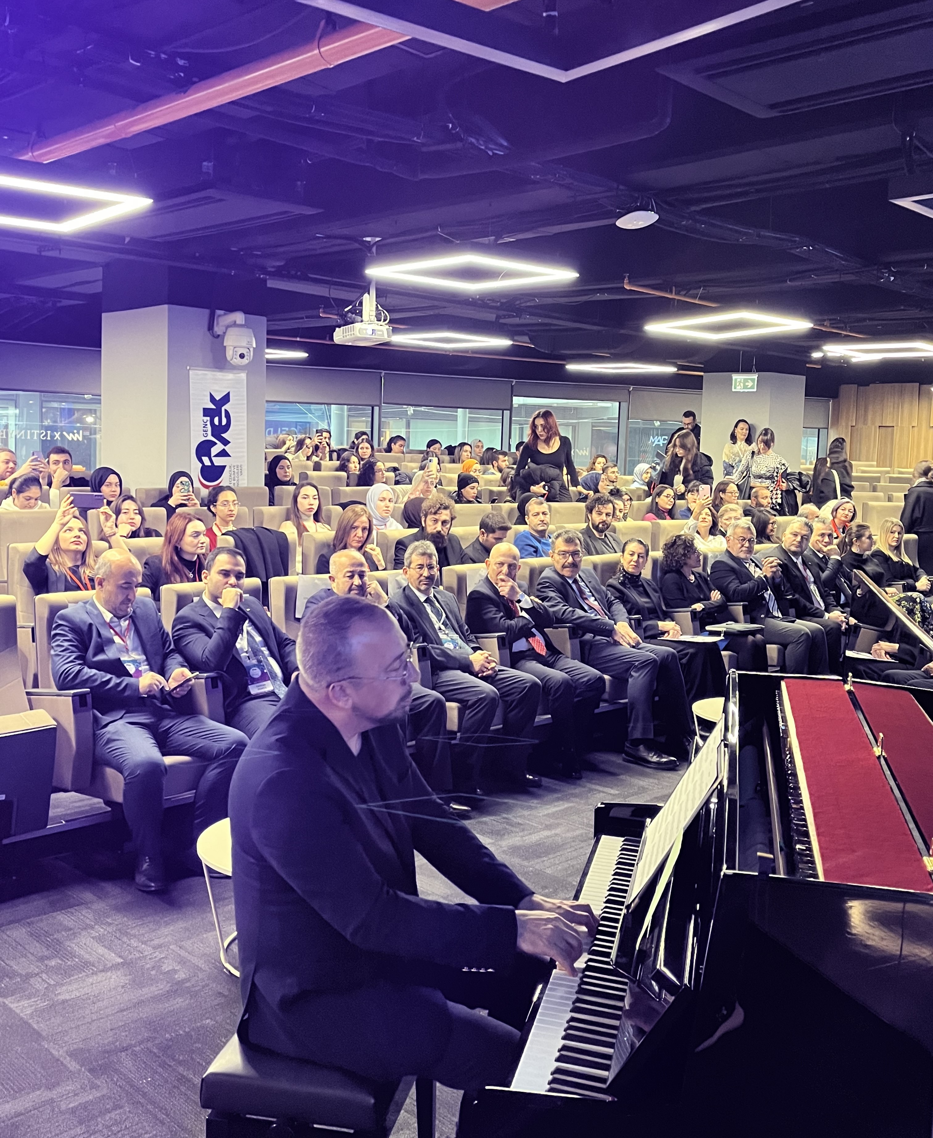 The Young IVEK Student Summit, held at the Istinye University Vadi H Campus, began with the national anthem and a moment of silence. Following this, a piano recital consisting of compositions by condcutor Ömer Yusuf Topçu captivated the audience, emphasizing the universality of art and its ability to create unforgettable moments.