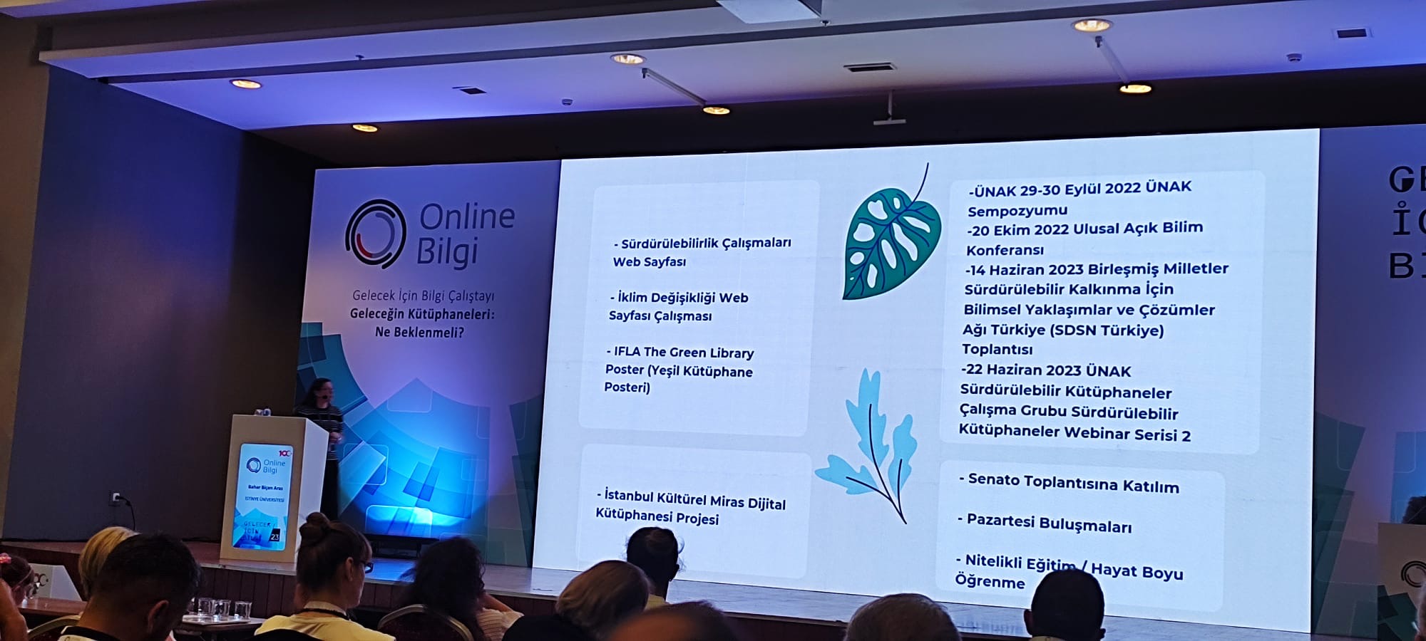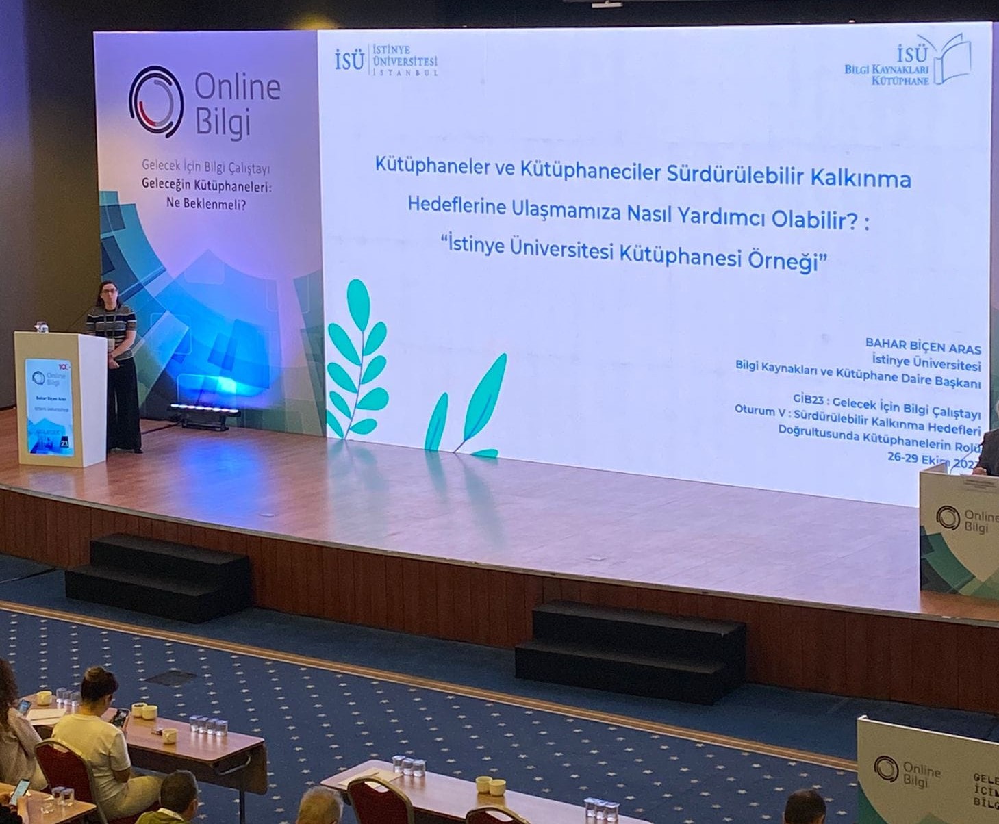 Bahar Biçen Aras, the Head of Information Resources and Library Department, participated as a guest speaker in the fifth session of the workshop, titled "The Role of Libraries in Achieving Sustainable Development Goals." In her presentation titled "How Can Libraries and Librarians Help Us Achieve Sustainable Development Goals? The Case of Istinye University Library," Bahar Biçen Aras discussed sustainability and the sustainability efforts of Istinye University and Istinye University Library within the context of libraries in general.