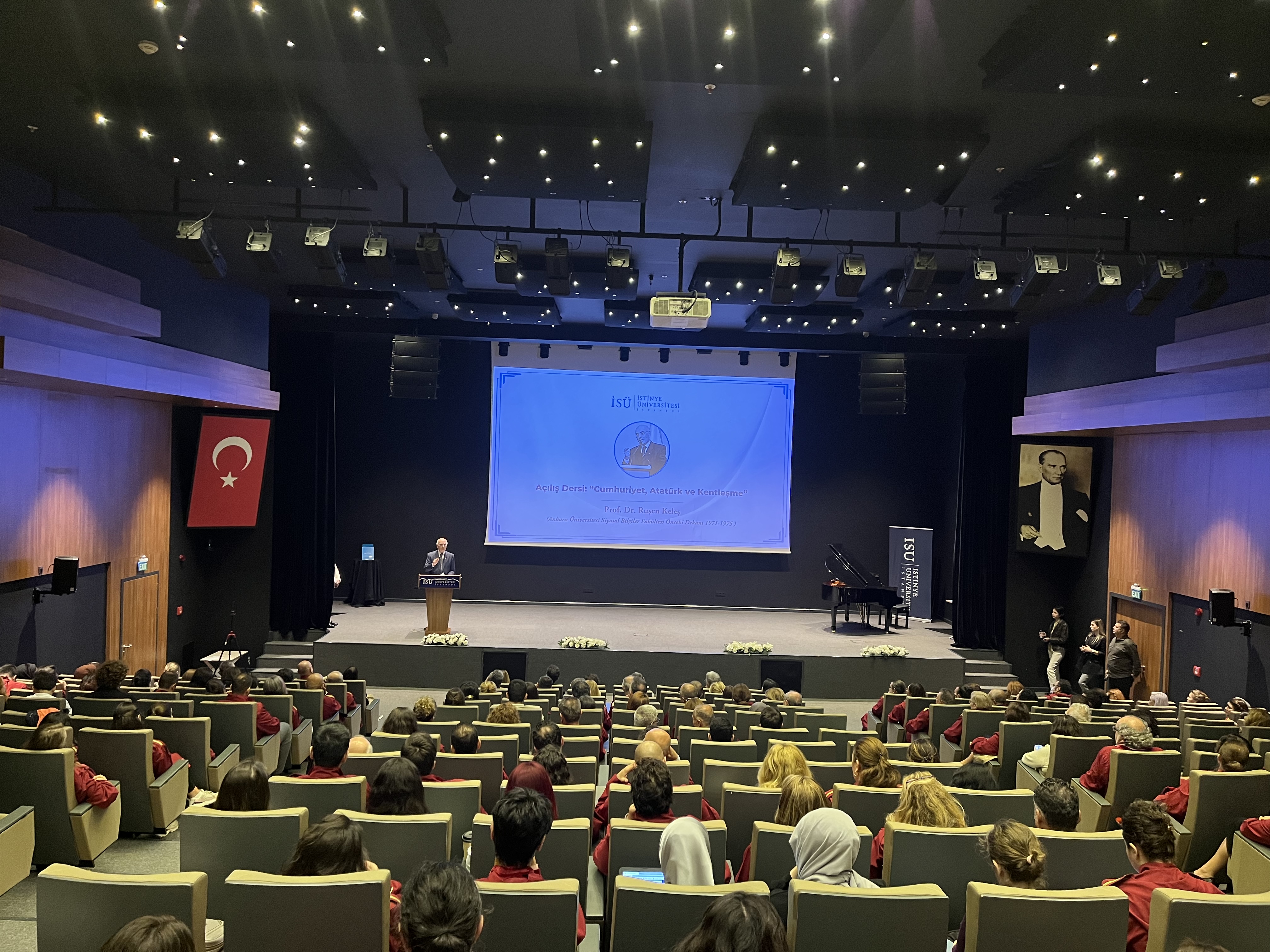 The initial moments of entering the new academic period began with the "Republic, Atatürk, and Urbanization" topic, followed with great interest by all attendees, as presented in the symbolic "opening lecture" prepared by the esteemed academician Prof. Dr. Ruşen Keleş.