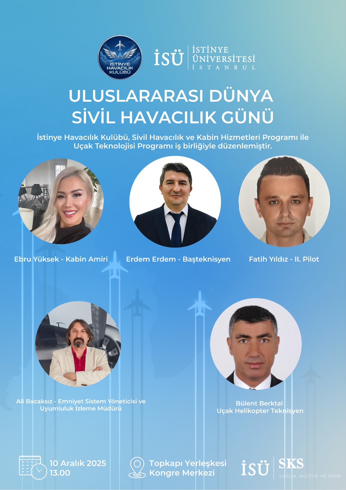 İstinye Üniversitesi, İstinye Havacılık Kulübü, Sivil Havacılık ve Kabin Hizmetleri Programı ile Uçak Teknolojisi Programı iş birliğiyle düzenlenen 10 Aralık 2025 tarihinde Topkapı Kampüsü Kongre Merkezinde gerçekleştirilecek “Uluslararası Dünya Sivil Havacılık Günü” etkinliğine davetlisiniz.