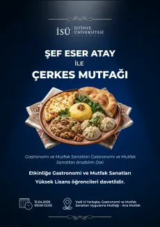 İstinye Üniversitesi, Gastronomi ve Mutfak Sanatları Anabilim Dalı tarafından 15 Nisan 2026, saat 09.00'da gerçekleşecek olan “Şef Eser Atay ile Çerkes Mutfağı” isimli etkinliğe davetlisiniz.