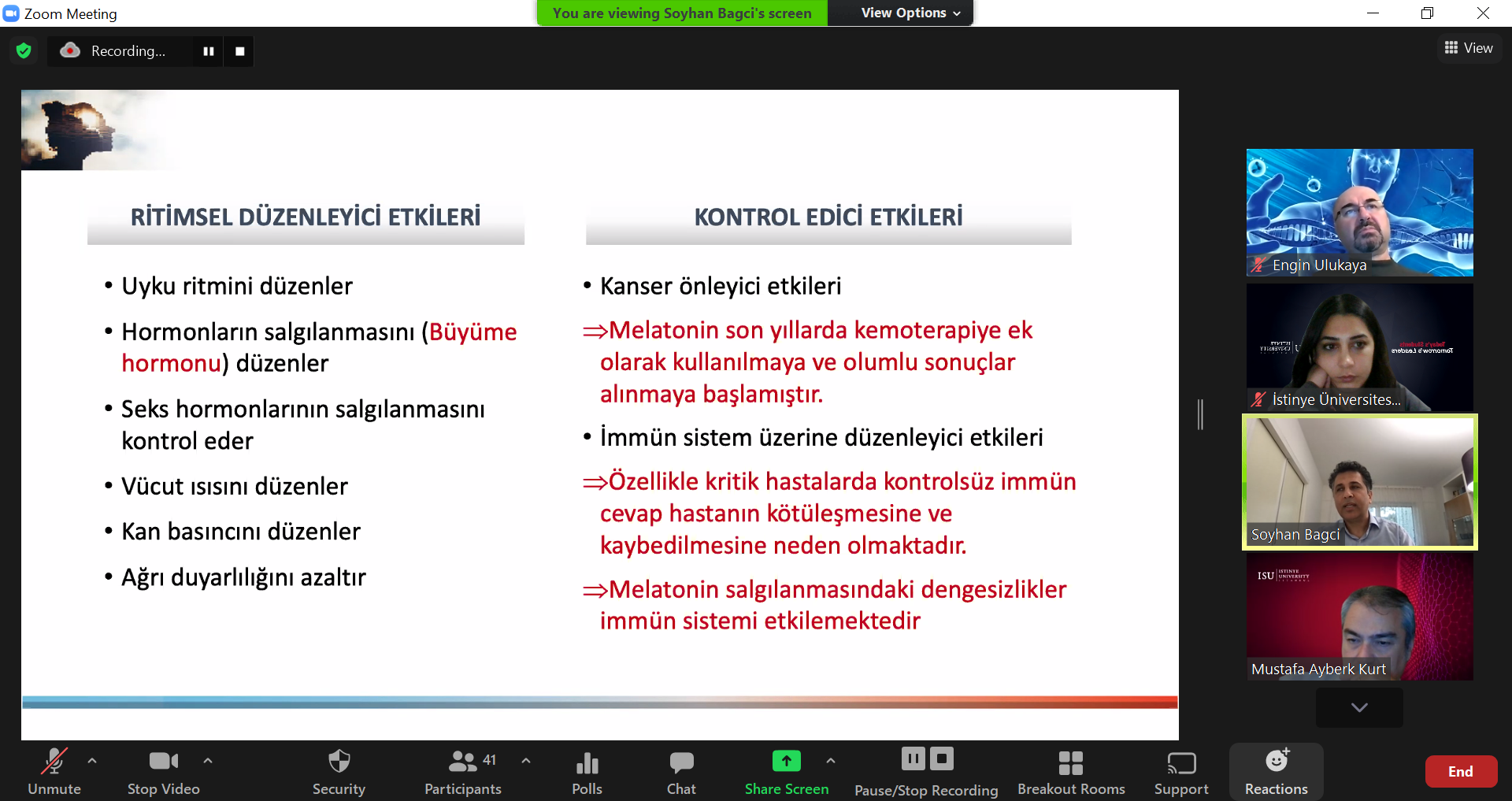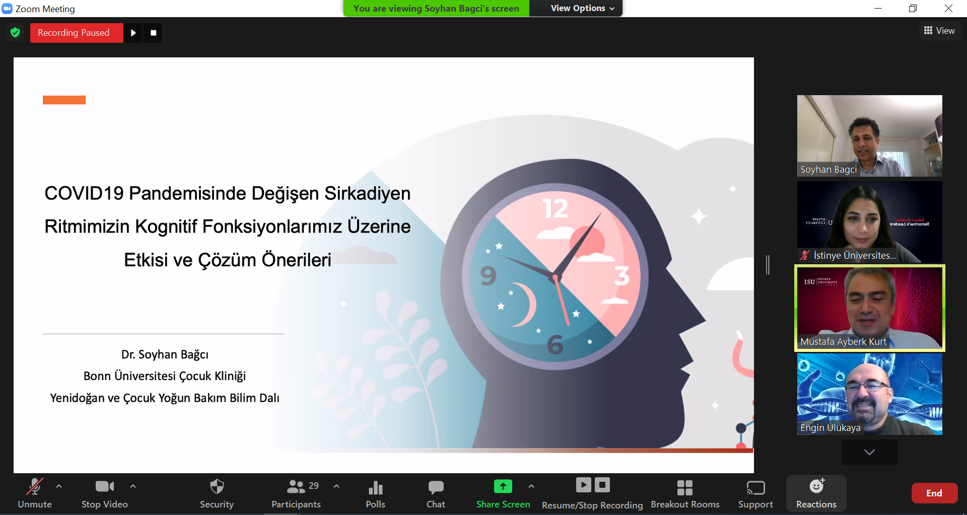 İstinye Üniversitesi Sürekli Eğitim Merkezi (İSÜSEM) tarafından düzenlenen ve Bonn Üniversitesi Öğretim Üyesi Dr. Soyhan Bağcı’nın konuşmacı olarak katıldığı Covid19 Pandemisinde Değişen Sirkadiyen Ritmimizin Kogniftif Fonksiyonlarımız Üzerine Etkisi etkinliği, çevrim içi olarak gerçekleşti.