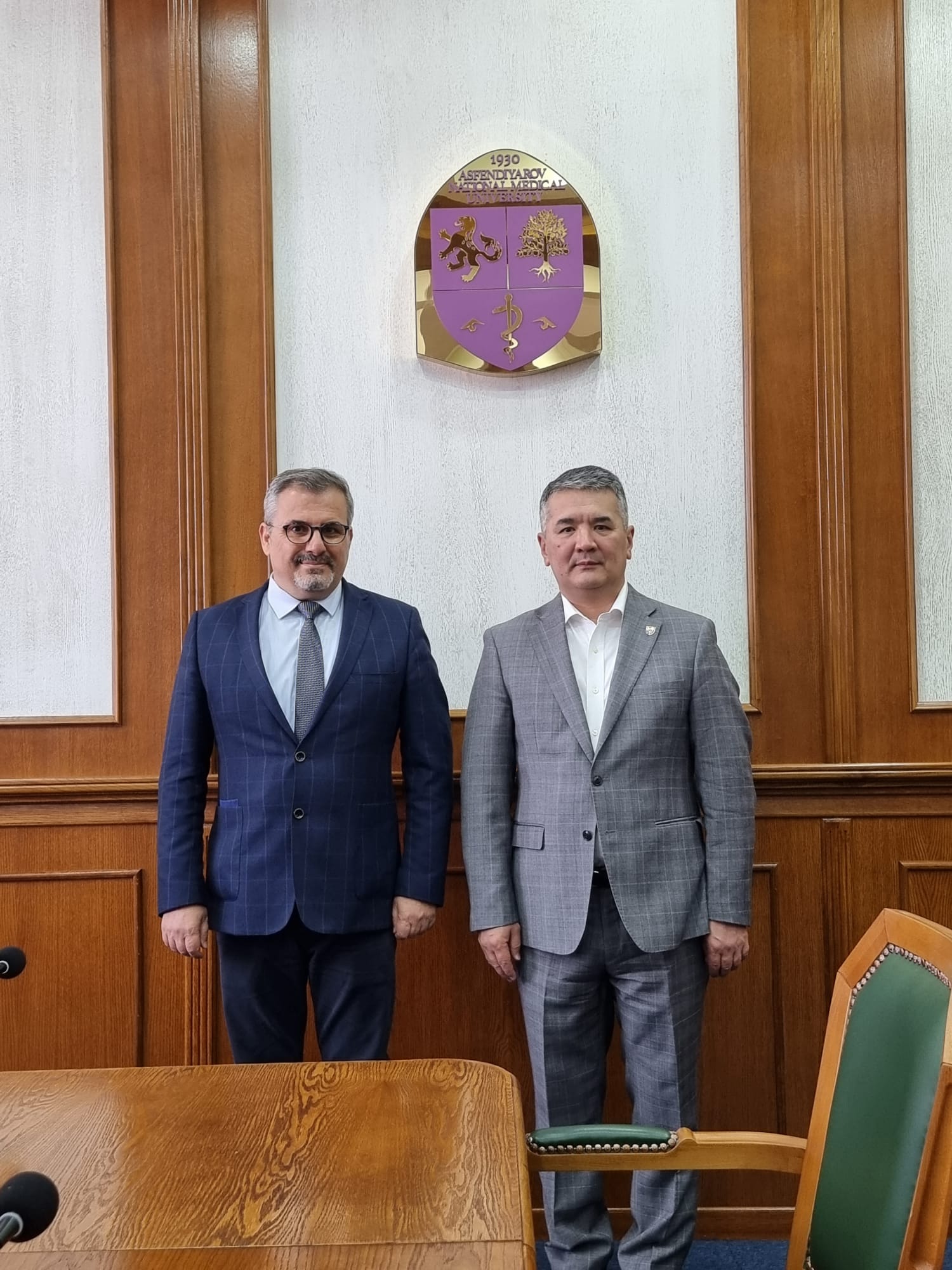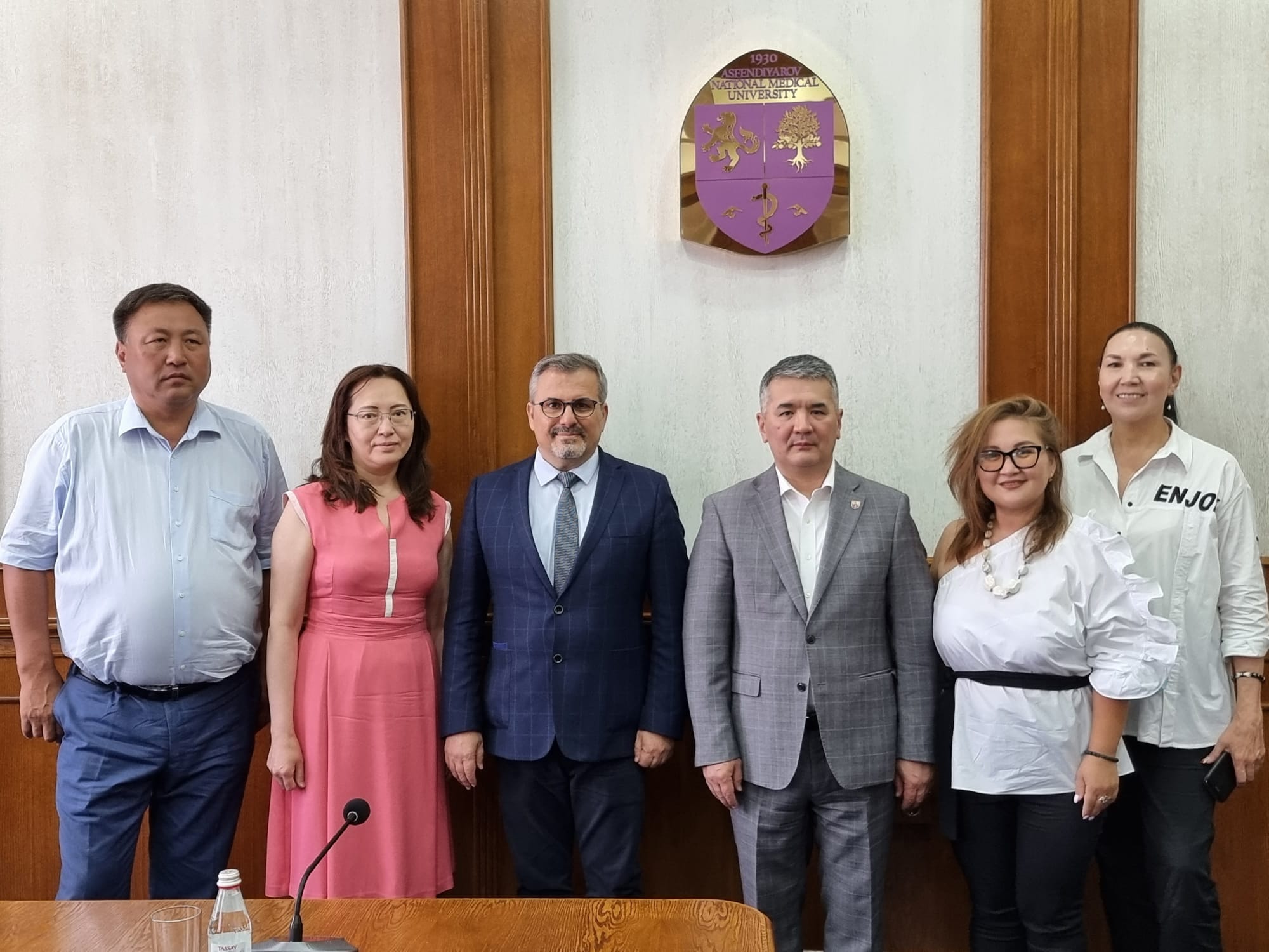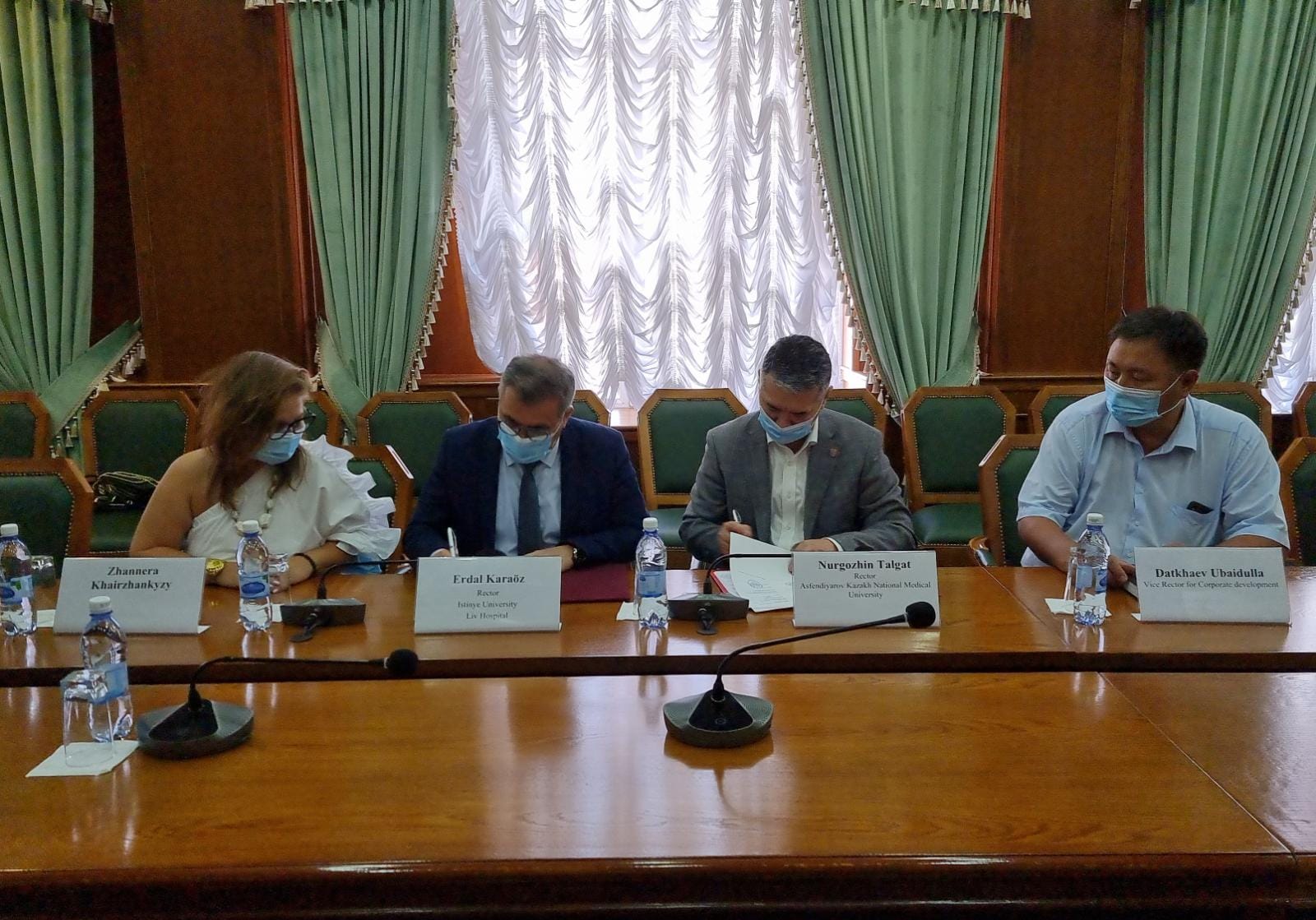 Üniversiteler arasında gerçekleştirilecek akademik ve bilimsel çalışmaları değerlendirmek üzere bir araya gelen Prof. Dr. Erdal Karaöz ve Alma Ata Asfendiyarov Uluslararası Sağlık Üniversitesi Rektörü Prof. Dr. Nurgozhin Talgat iş birliği anlaşmasını imzaladı. Prof. Dr. Nurgozhin Talgat tarafından Ekim ayında düzenlenecek Türkçe Konuşan Ülkeler Rektörler Toplantısına davet edilen Prof. Dr. Erdal Karaöz, ev sahipliği ve oluşturulan ortak çalışma ortamı için teşekkürlerini sundu.
