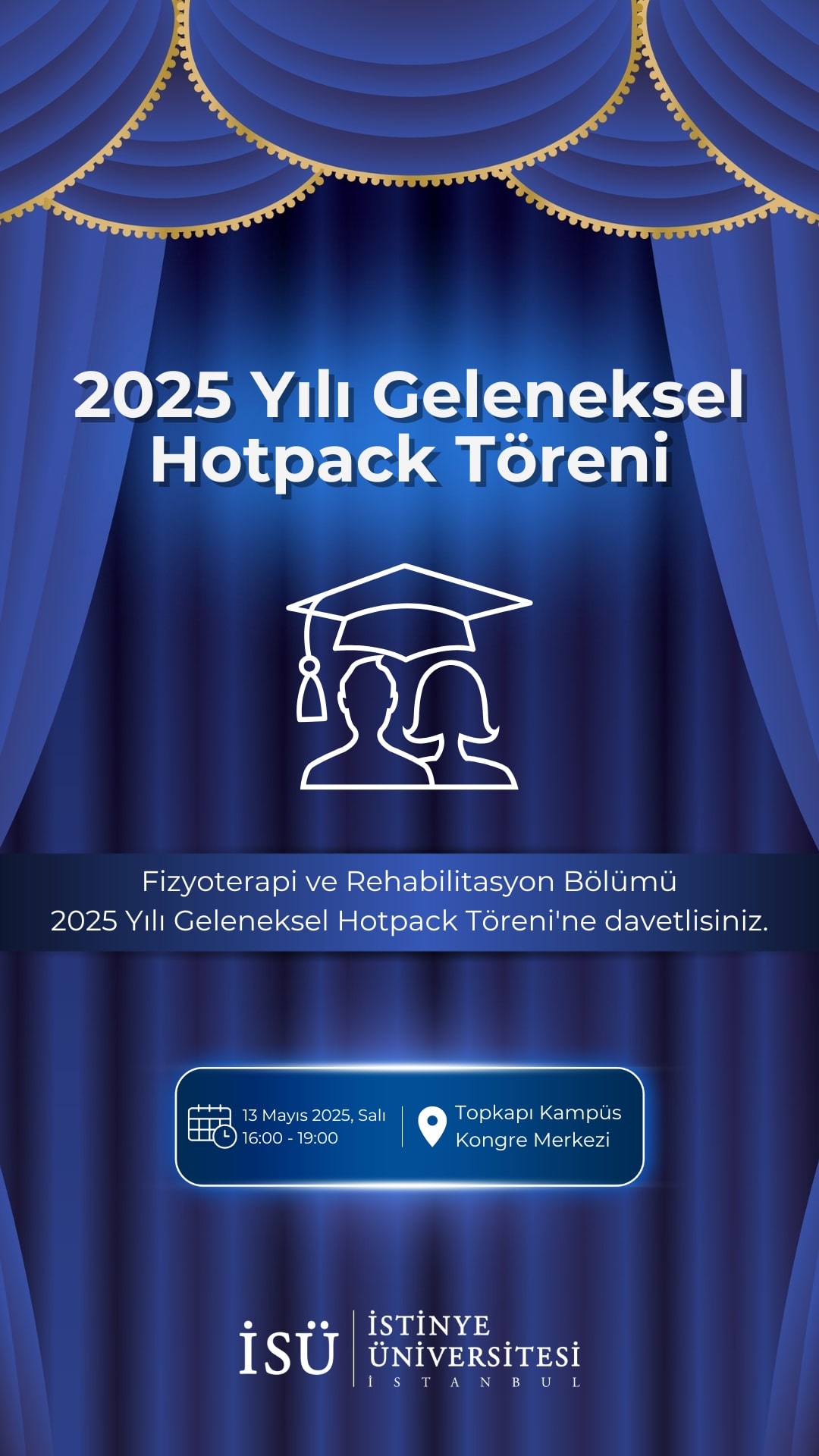 İstinye Üniversitesi Fizyoterapi ve Rehabilitasyon Anabilim Dalı Başkanlığı tarafından 13 Mayıs 2025, Salı günü saat 16.00'da Topkapı Kongre Merkezi'nde gerçekleştirilecek olan 2025 Yılı Geleneksel Hotpack Töreni'ne davetlisiniz.