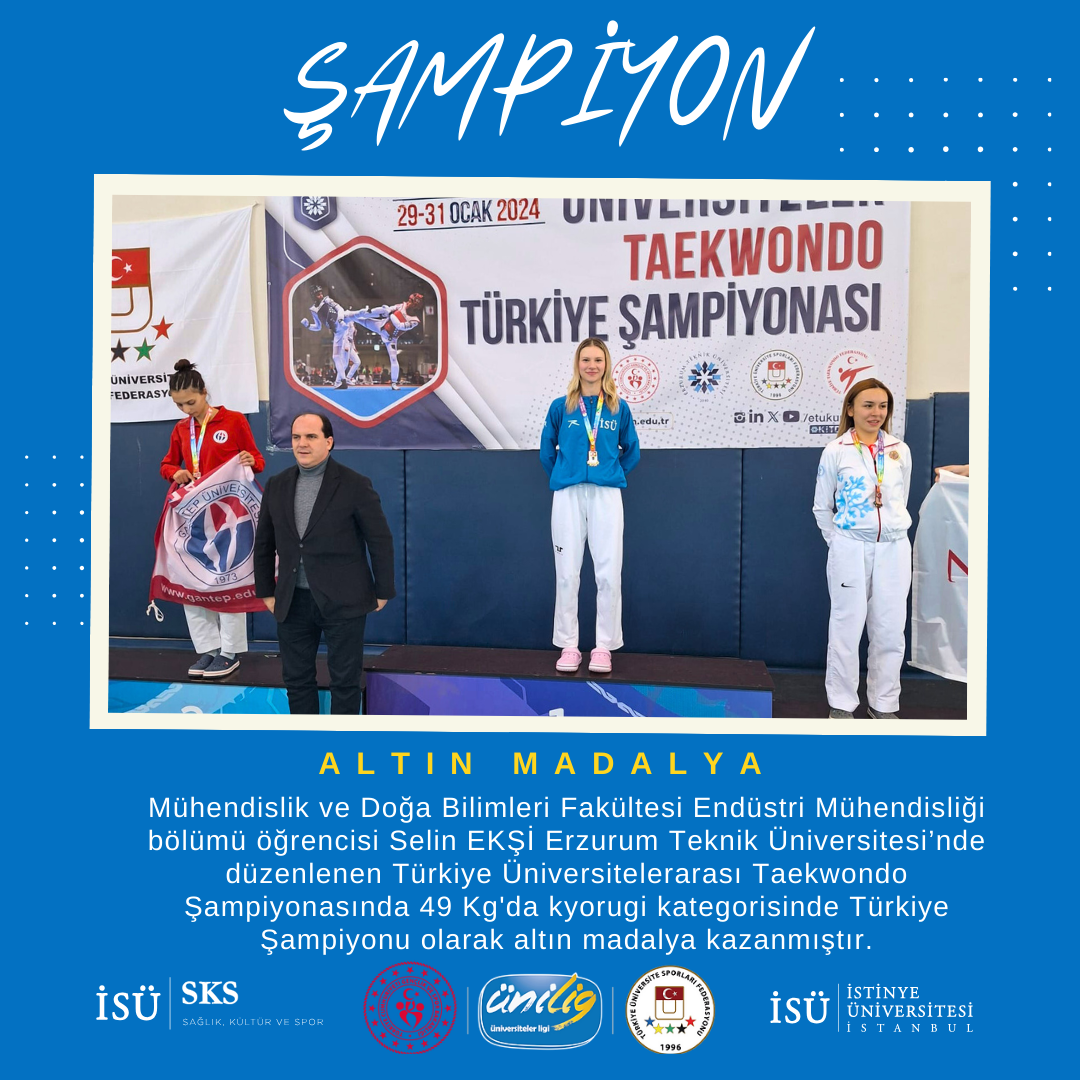 Our Faculty of Engineering and Natural Sciences, Department of Industrial Engineering preparatory class student Selin EKŞİ won the gold medal and became the Turkish Champion in the 49 kg kyorugi category at the Turkish Inter-University Taekwondo Championship held at Erzurum Technical University.