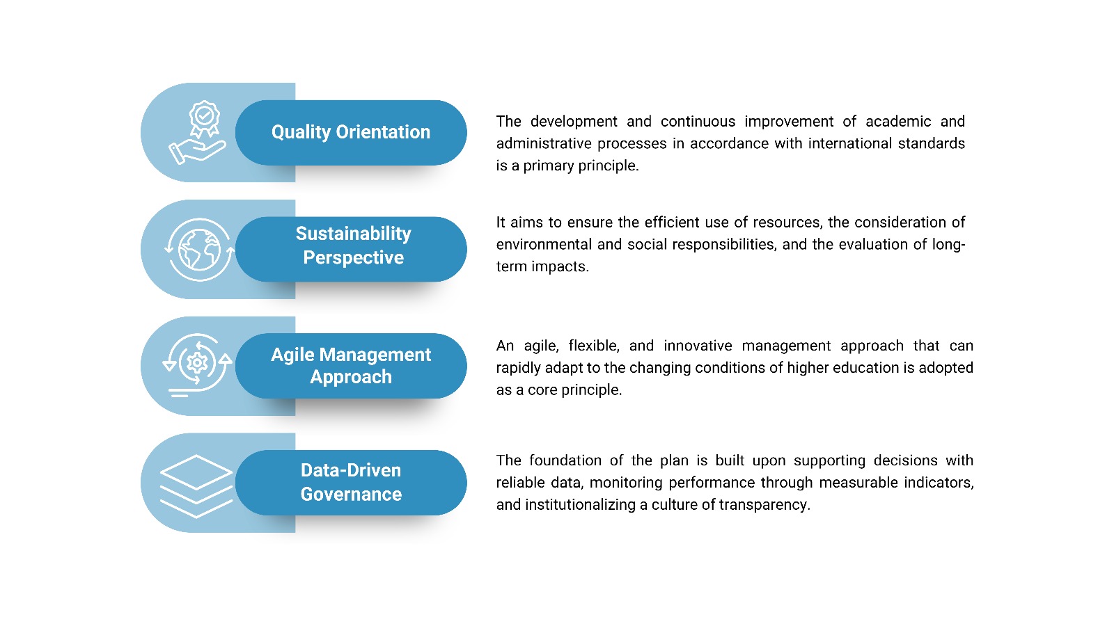 The Third Five-Year Action Plan is not merely a collection of projects; it also represents a comprehensive framework of guiding principles that shape Istinye University’s strategic transformation journey. These principles, which support the vision of the plan and guide its implementation processes, play a pivotal role in leading the University toward achieving its 2030 goals.