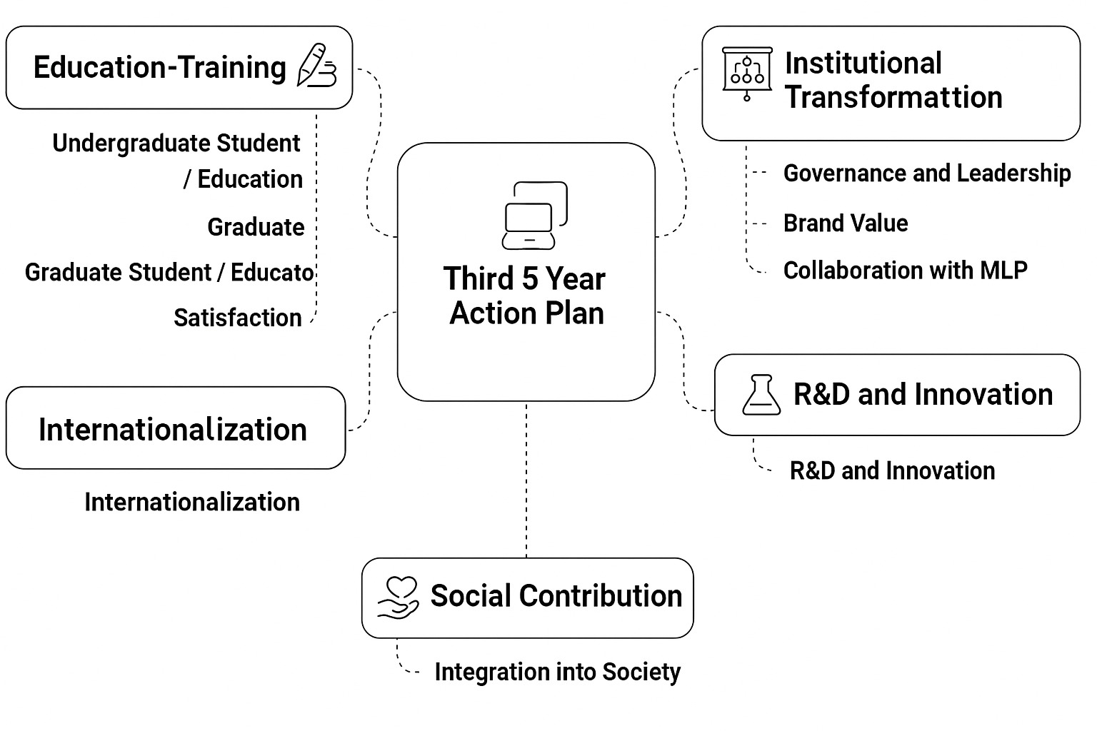 The success of the plan is monitored and evaluated through 73 Key Performance Indicators (KPIs). These indicators systematically track factors such as student achievement and graduate employability in education; publication output, project development, and patent generation in research; mobility in internationalization; social responsibility initiatives in community engagement; and digitalization and quality assurance in institutional development. The Third Five-Year Action Plan serves both as a strategic guide and as a shared vision commitment that reflects all stakeholders’ dedication to achieving the University’s 2030 Vision.