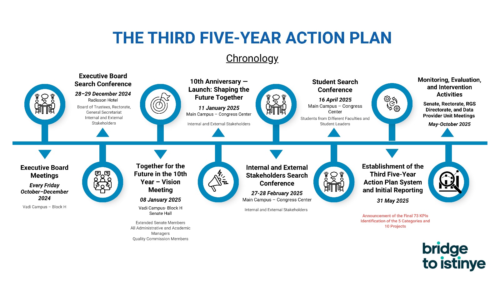 Istinye University’s Third Five-Year Action Plan (2025–2030) is a comprehensive roadmap designed to achieve the University’s 2030 Vision. The plan was developed to systematically manage institutional development processes. The action plan initiatives began in the 2024–2025 academic year. Throughout the process, search conferences were organized with the participation of students, academic and administrative staff, and input was gathered from various internal and external stakeholders. The plan was presented to all stakeholders during the Vision Meeting held in January 2025, where the University’s strategic goals were shared within a unified framework.