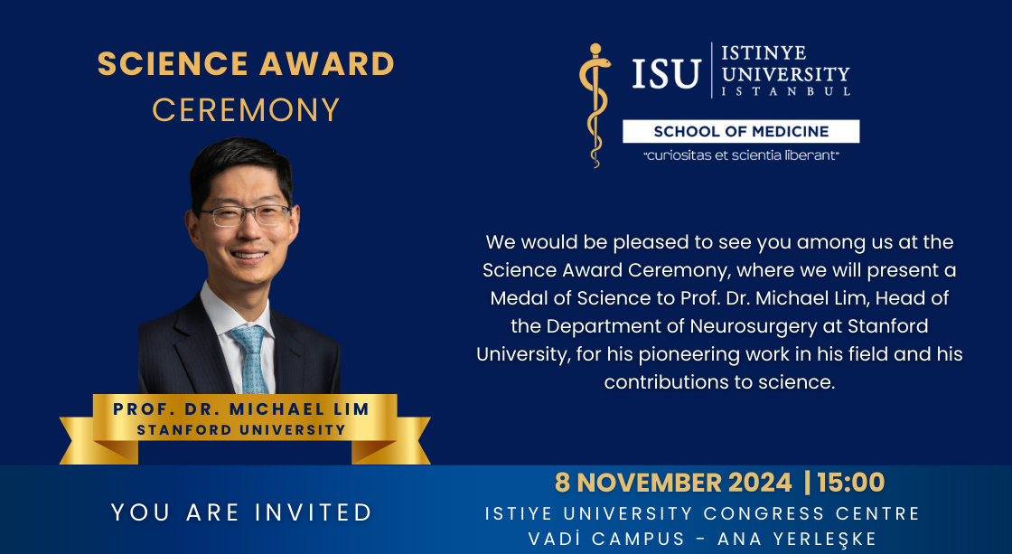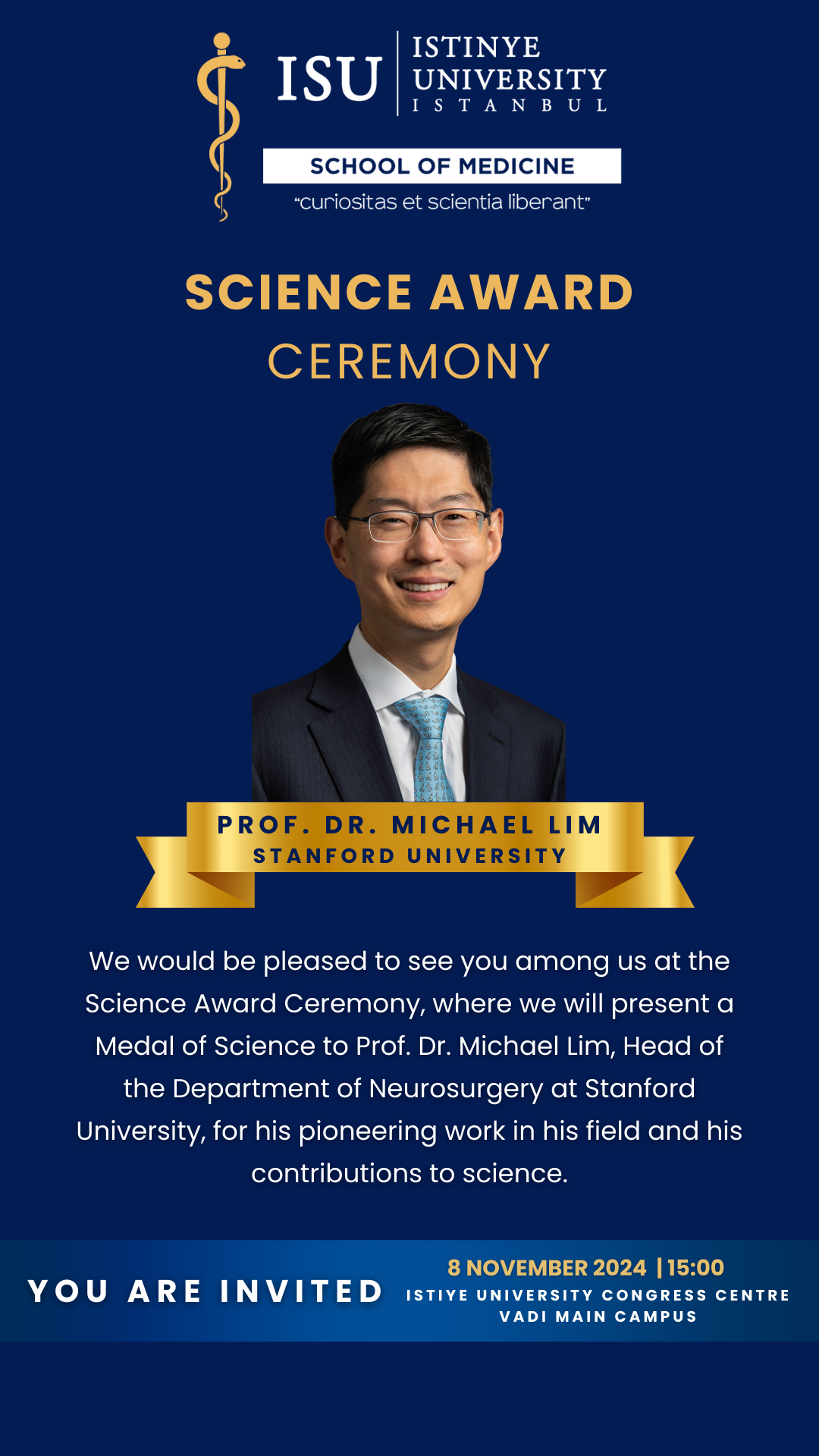We would be pleased to see you among us at the Science Award Ceremony, where we wii present a Medal of Science to Prof. Dr. Michael Lim, Head of the Department of Neurosurgery at Stanford University, for his pioneering work in his field and his contributions to science.