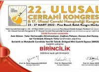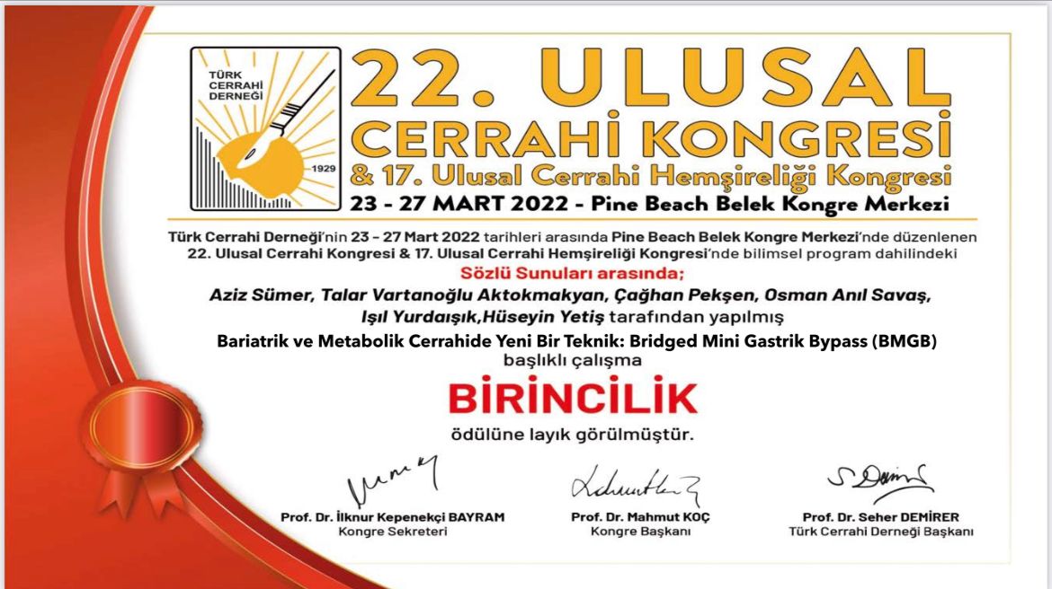 Istinye University Faculty of Medicine Faculty Members, Prof. Dr. Aziz Sumer, Assistant professor Talar Vartanoglu Aktokmakyan, Assistant professor Caghan Peksen, Assistant professor Osman Anil Savas, Assistant professor Işıl Yurdaışık's presentations titled "A New Technique in Bariatric and Metabolic Surgery: Bridged Mini Gastric Bypass (BMGB)" at the 22nd National Surgery Congress held in Antalya was deemed worthy of the oral presentation first prize.