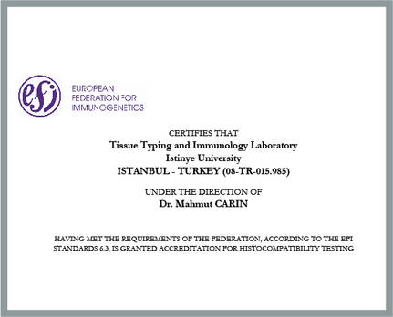 Bölümümüz EFI (European Federation for Immunogenetics) ve ISO9001 Akreditasyonlarına sahiptir.