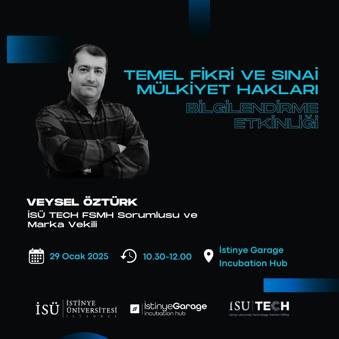 İSÜ TECH Teknoloji Transfer Ofisi ve İstinye Garage Girişimcilik ve Kuluçka Merkezi işbirliğinde 29 Ocak 2025 tarihinde, 10.30-12.00 saatleri arasında, İstinye Garage Incubation Hub’da, “Temel Fikri ve Sınai Mülkiyet Hakları Eğitimi” düzenlenecektir. Etkinliğe tüm akademisyenlerimiz davetlidir.
